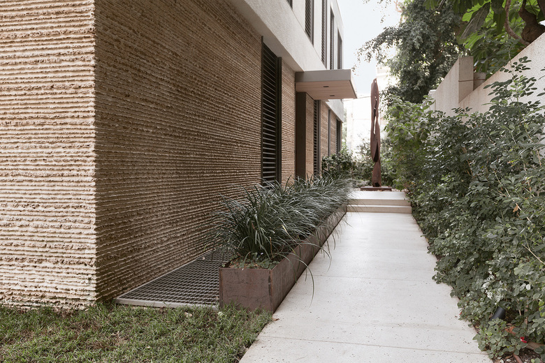 Klar strukturierte Fassade mit handwerklich anspruchsvollen Oberflächen. Die Fassade des Erdgeschosses wurde in Handarbeit mit Natursteinriemchen verkleidet. Die Außenwand des darüber liegenden Geschosses wurde in der Waschputztechnik ausgeführt. Der Grundriss im Erdgeschoss zeichnet sich mit offenen Übergängen von innen nach außen aus. Die Terrassen und Freisitze verbinden sich räumlich mit der inneren Grundrissstruktur und bilden eine architektonische Einheit. Die Funktionsbereiche im Erdgeschoss sind locker aneinander gereiht und erlauben fließende Übergänge zum Garten.