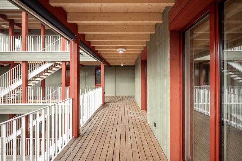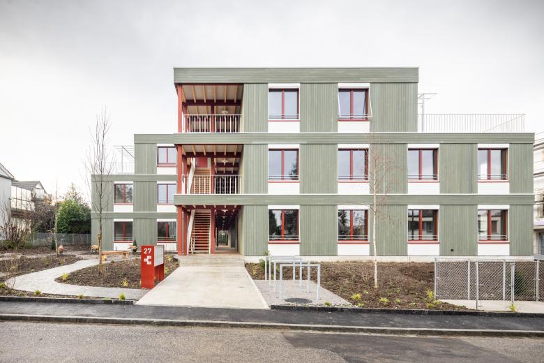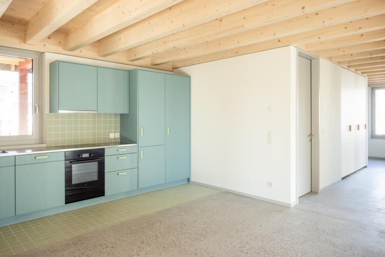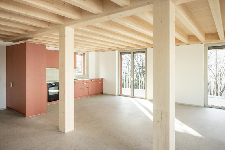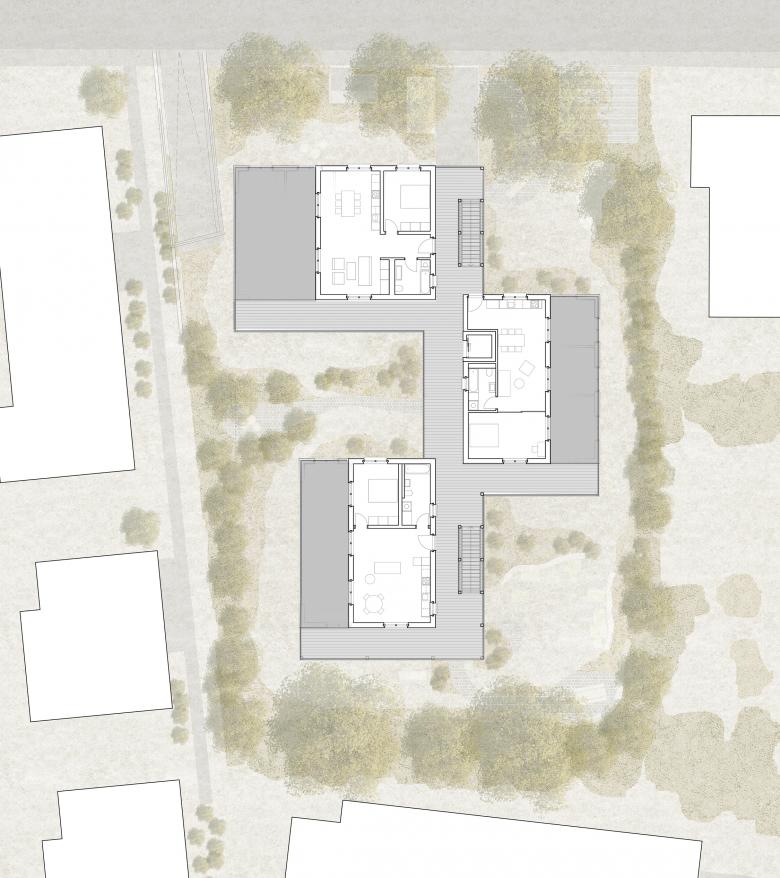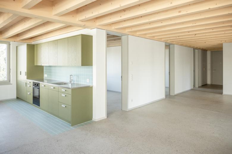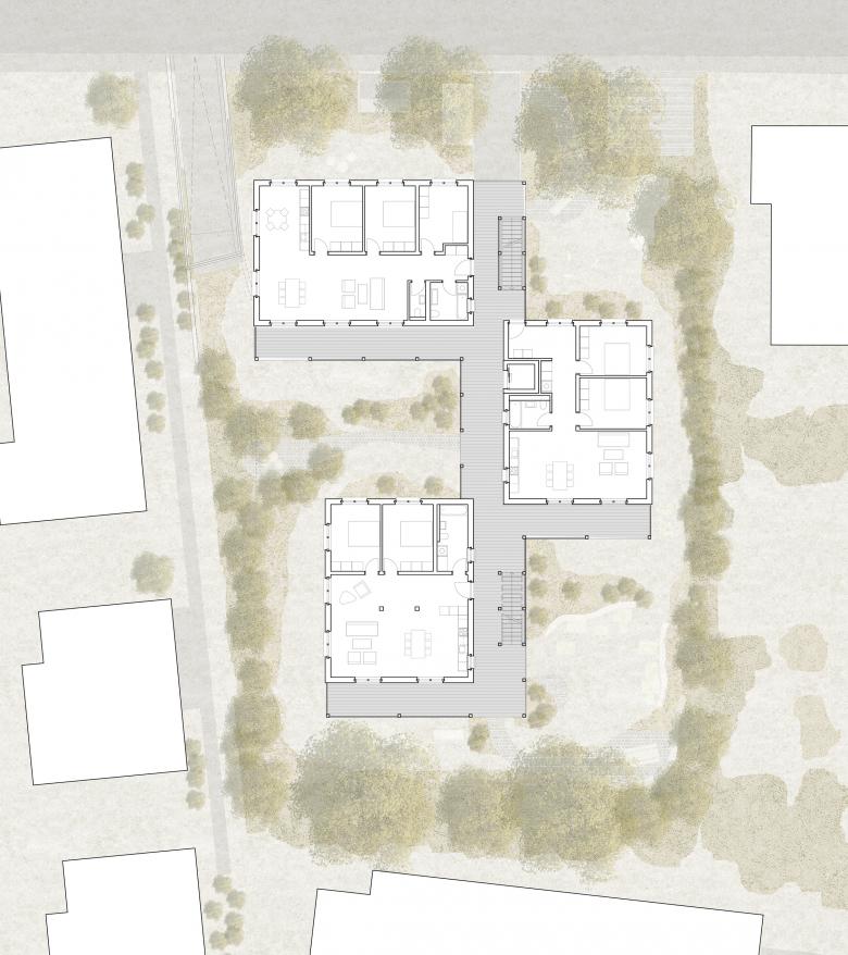 Die Volumetrie der neuen Wohnüberbauung wird auf drei dreigeschossige Gebäudekörper verteilt die versetzt zueinander angeordnet werden. Durch die Vor-und Rücksprünge verzahnt sich das Gebäude in der Umgebung und schafft eine für das Einfamilienhausquartier angemessene Massstäblichkeit. Die Staffelung der Gebäudekörper lässt den Grünraum nahe an das Gebäude treten, wodurch eine symbiotische Verbindung zwischen Architektur und Natur entsteht. Der Zugang zur neuen Wohnüberbauung erfolgt durch ein stufenweises Annähern. Vom öffentlichen Raum gelangt man zunächst in die halböffentliche Erschliessungszone, bevor man schließlich den privaten Wohnraum betritt. Die zentral gelegene Erschliessungsachse erstreckt sich über die ganze Gebäudetiefe und verbindet die einzelnen Volumen miteinander. Sie ist das Herzstück der Überbauung und dient neben der Erschliessung der einzelnen Wohnungen auch als Ort der Begegnung und des Austauschs. Der Neubau ist als konsequenter Holzbau konzipiert. Das sichtbare statische Tragwerk und die präzise tektonische Fügung der einzelnen Bauteile bestimmen das äussere Erscheinungsbild. Die Gebäudehülle besteht aus einer vertikalen Holzschalung in einem zurückhaltenden Grünton. Im Bereich der Deckenstirn ändert sich die Schalungsrichtung, wodurch die facettenreichen Konturen des Gebäudes zusätzlich hervorgehoben werden. Das sichtbare Tragwerk setzt sich auch im Innern der Wohnungen fort. Die klaren und prägnanten Grundrisse sind auf die statische Struktur abgestimmt, welche die Wohnungen charakterisiert und ihnen ihren individuellen Ausdruck verleiht.