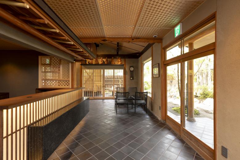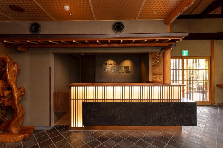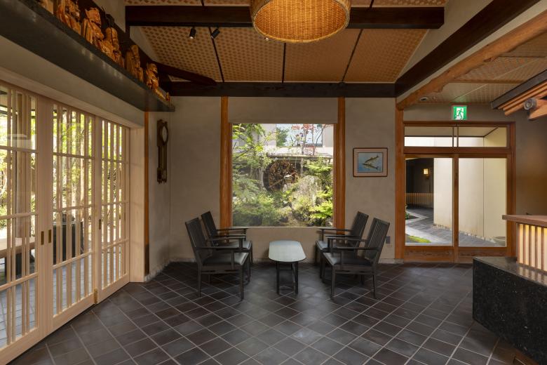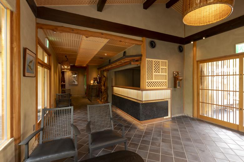 エントランスには、特別に焼成した陶板タイルを敷き、足元から土の質感を感じられるように。壁には藁スサを混ぜ込んだ左官仕上げを施し、田舎の温もりがにじむ表情をつくり出しました。さらに、組子細工の灯りと杉の網代天井が織りなす陰影が、訪れる人を穏やかに迎えます。新たに設けた大きな開口の先には、水車の庭がひらけ、風に揺れる葉や移ろう季節の色彩が、静かな時間を描きます。レセプションカウンターには、浮遊感をたたえた研ぎ出し仕上げを採用。内部には、由布=木綿(ゆふ、楮に由来)という語源にちなみ、楮のスサを練り込み、この地の記憶をさりげなく映し出しています。多様な素材が静かに調和し、空間全体の気配をやわらかく整えています。