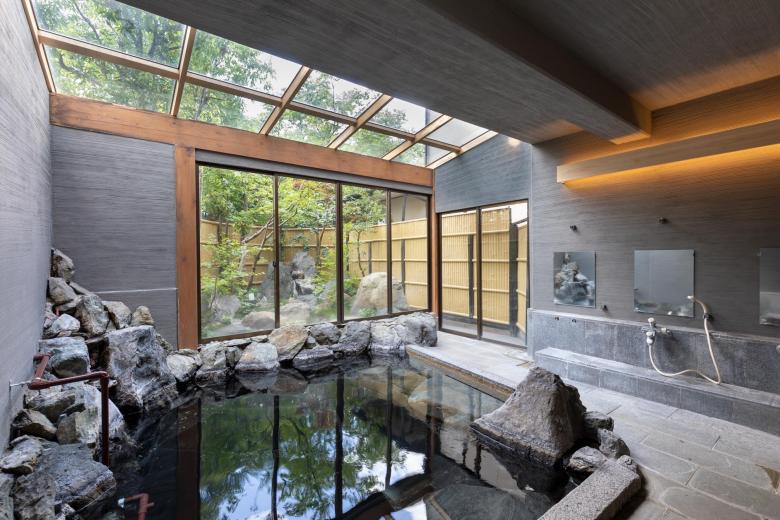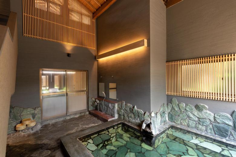 男女入れ替え制の大浴場「花子の湯」「太郎の湯」は、それぞれ異なる体験を楽しめる湯処です。2階組みの「太郎の湯」では、かつて一体化していた巨大な浴槽を改修し、天然石の岩風呂と壺湯、小庭を新たに設えました。上階の半露天風呂からは由布岳の稜線が遠望できます。「花子の湯」では既存の露天風呂の岩を活かしながら庭として再生。ガラスの屋根と窓を通して、岩の庭や夜空を眺められる内湯とし、光と緑が静かに移ろう上質な湯浴みの場となりました。
