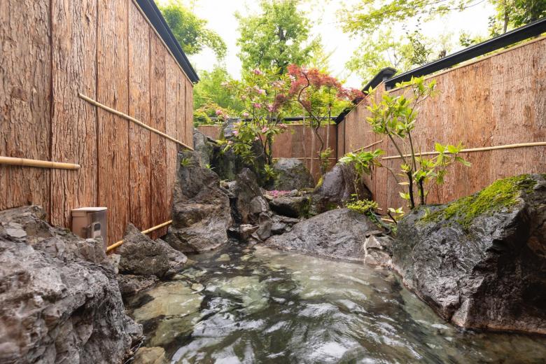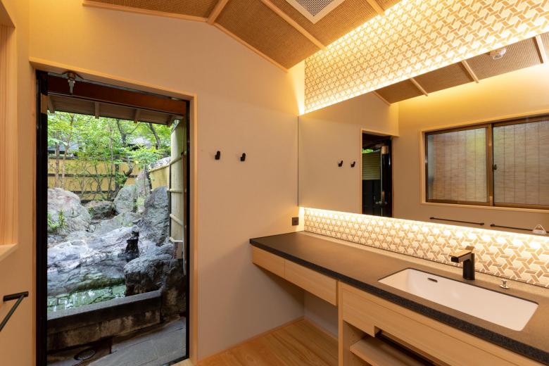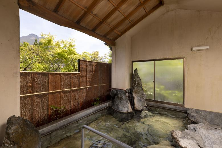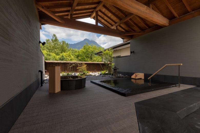 客室では、押入れだったスペースに冷蔵庫や掛け収納をしつらえるなど、現代の滞在に寄り添った和モダンの設えとしています。和紙や竹細工、竹編みを想起させる文様のモザイクタイルなど、由布の風土と響き合う素材を随所に取り入れ、くつろぎの時間に静かな品格を添えました。1階の特別な客室に備えられた露天風呂は、杉皮張りの塀で囲い、当初のお庭を更に上質な空間に。自然に溶け込むような設えのなかで、誰にも邪魔されない穏やかな湯の時間をお楽しみいただけます。