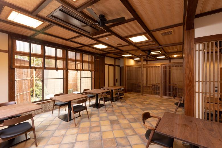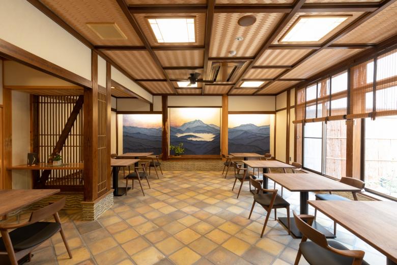 食事処は、かつての畳敷き大広間を刷新し、靴のまま気軽に立ち入れるフラットなダイニング空間へ。床にはエントランスよりもさらに表情豊かな土もの陶板タイルを用い、壁面には藍染和紙で漉き上げた由布の山並みを設えました。やわらかな朝の光に包まれながら、土地の空気を感じる食のひとときをお楽しみいただけます。