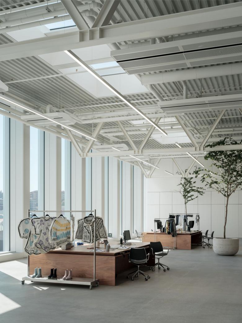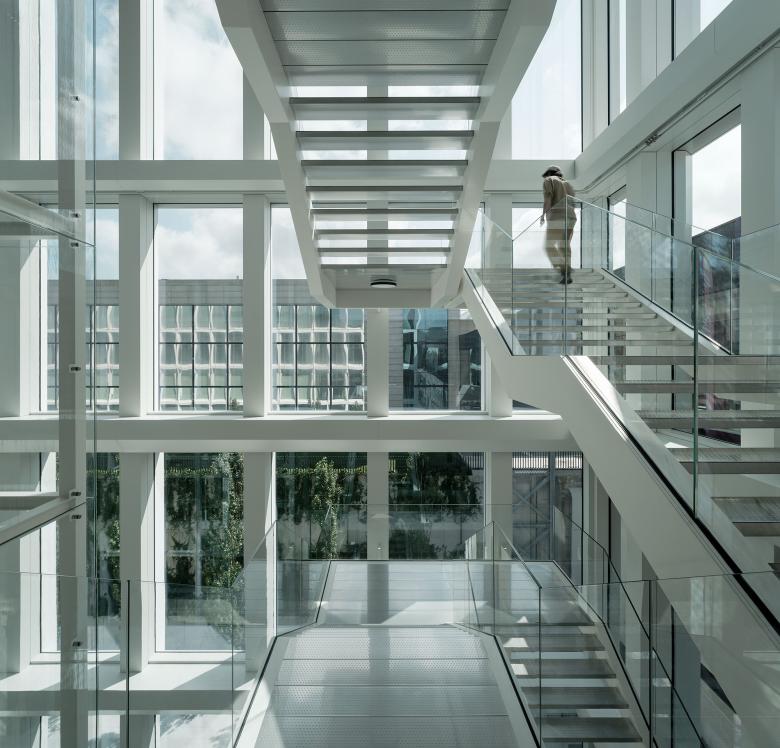 Organised across five floors of 90 × 90 m, the building comprises two expansive, high-ceilinged work areas, complemented by support and service zones located along the sides and centre of each floor.