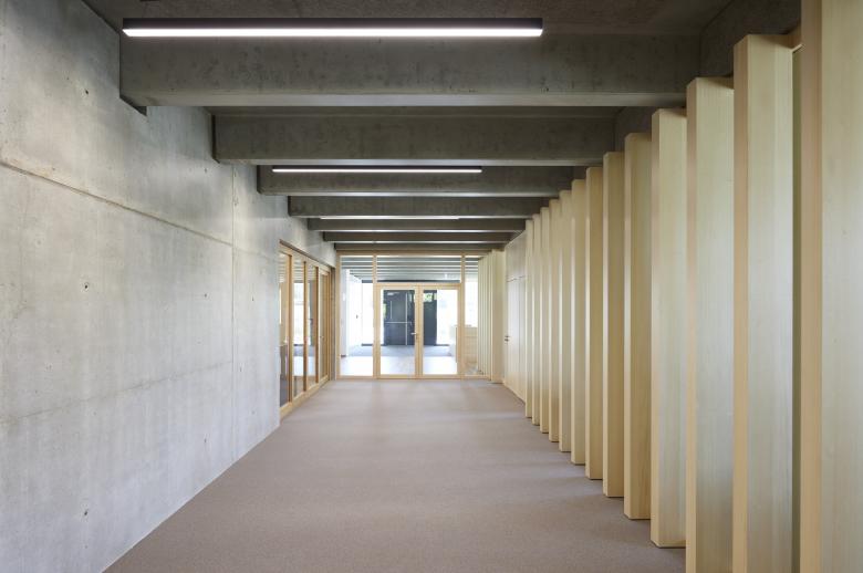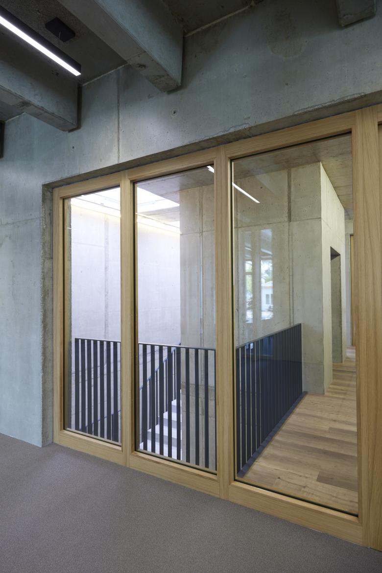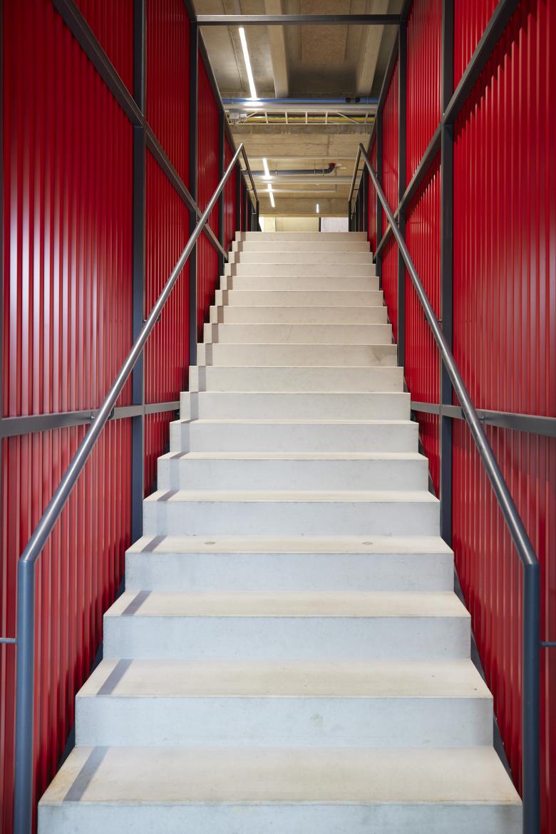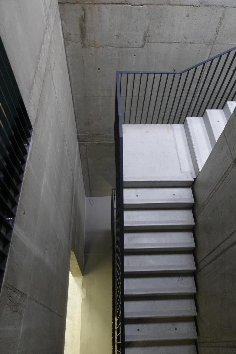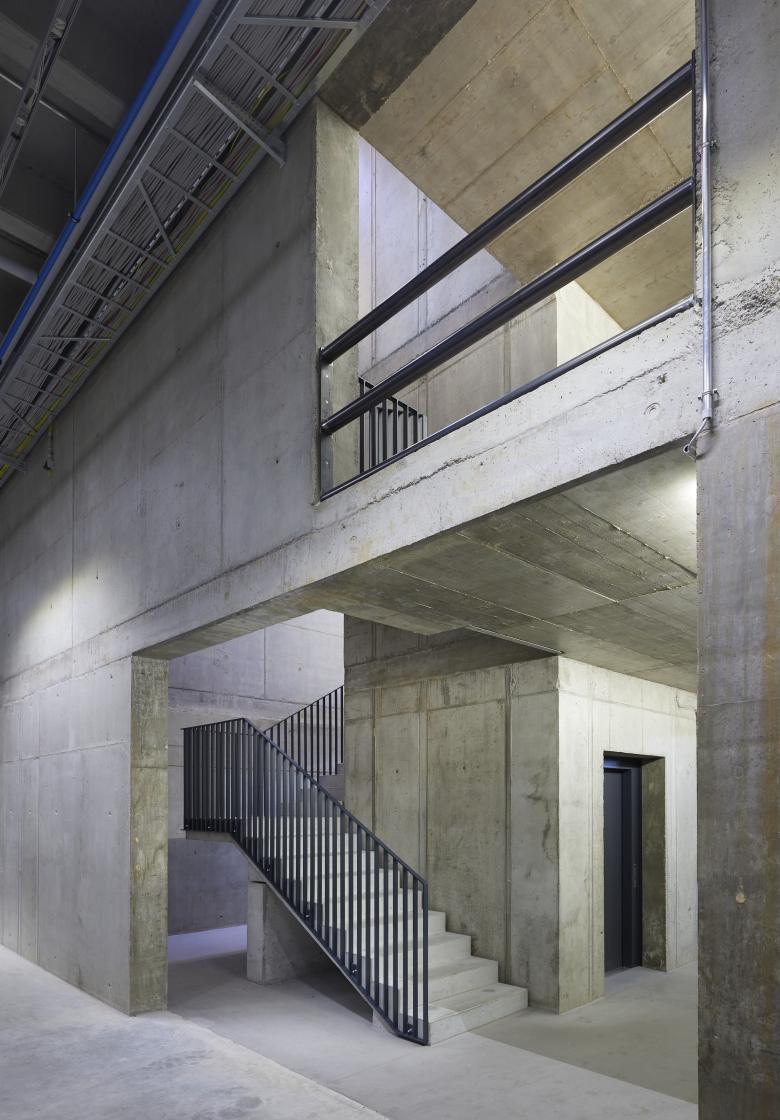 Der zentral angeordnete Erschliessungskern in wahrnehmbarer spöder Schachtqualität macht neugierig auf die räumliche Entwicklung der hangeingebetteten Produktionsbereiche.