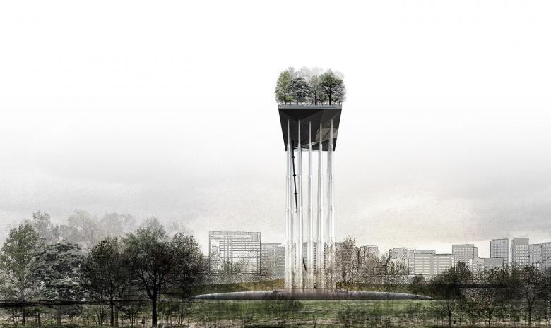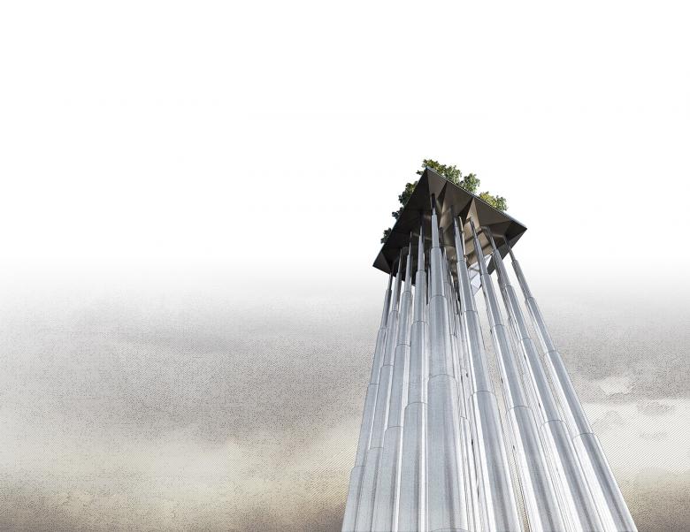 The proposed mass of 250 tons includes planters and various specimens acquired from the park. It rests on hydraulic pistons lifting it up 60 meters to become an observation deck for visitors.