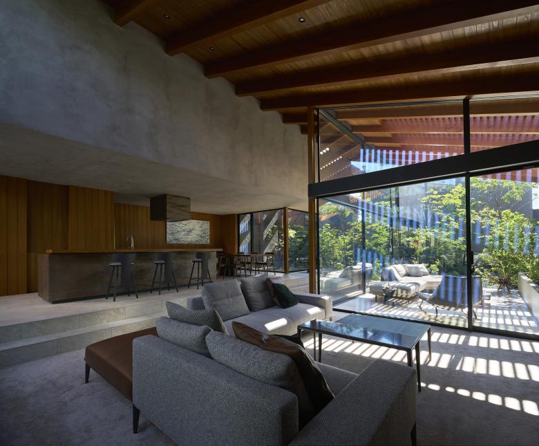 Each of the seven gardens is closely related to adjacent interior spaces and fulfills a distinct role depending on its location. The larger central courtyard and south garden accommodate an outdoor dining area and an outdoor living space, creating a gradational continuity between interior, intermediate, and exterior zones that lends depth to the overall spatial experience. Louvers softly filter views from the surroundings and mitigate direct sunlight, ensuring a comfortable outdoor environment.