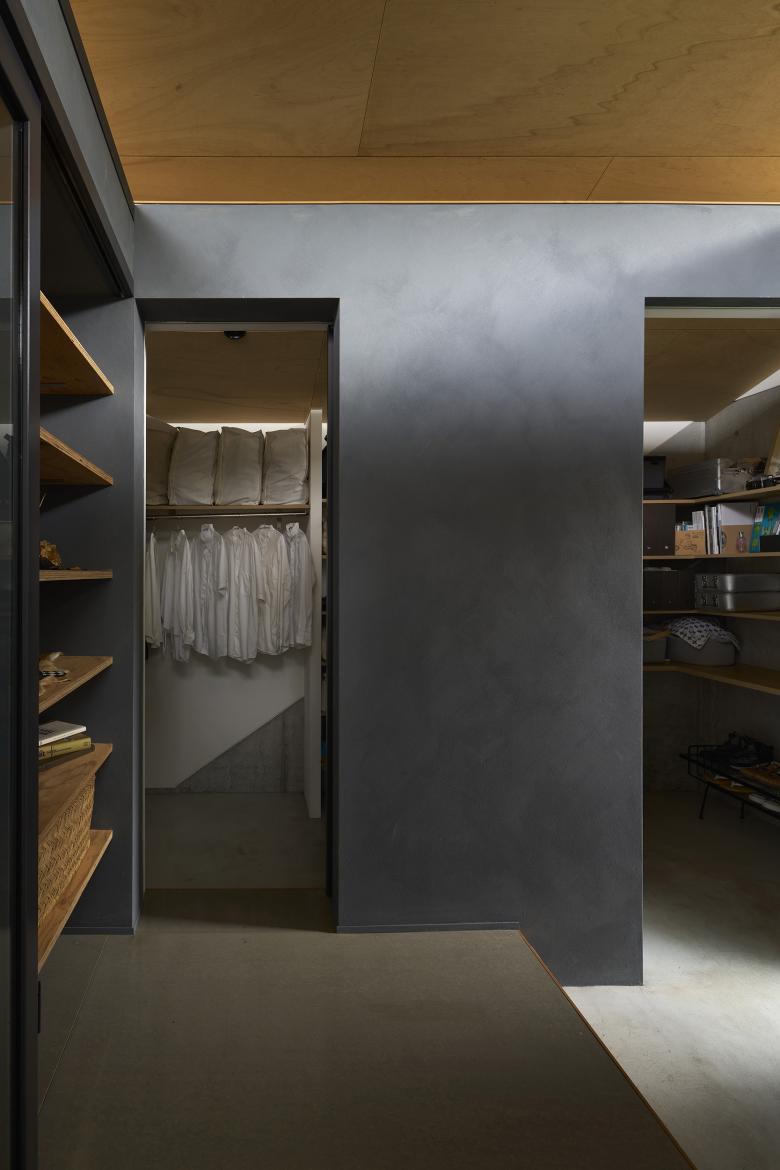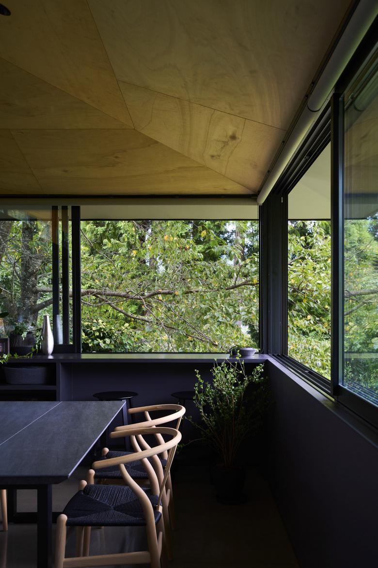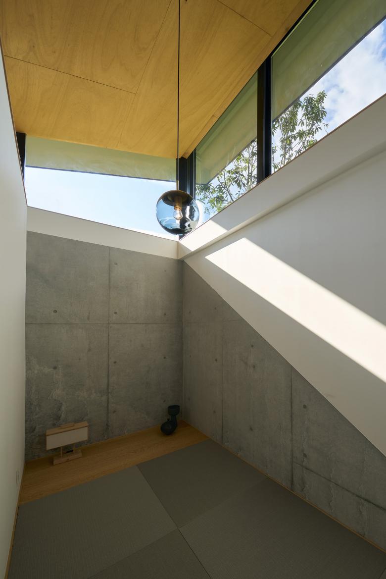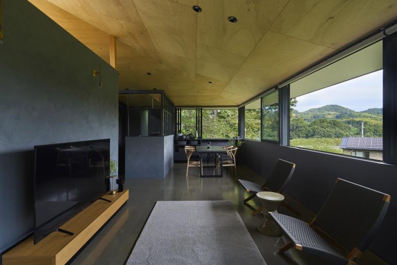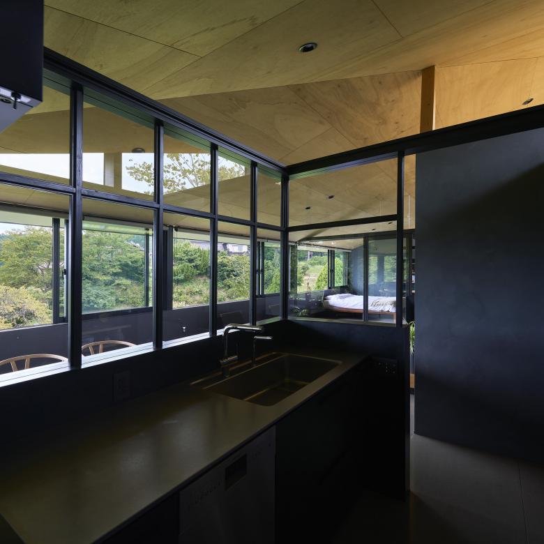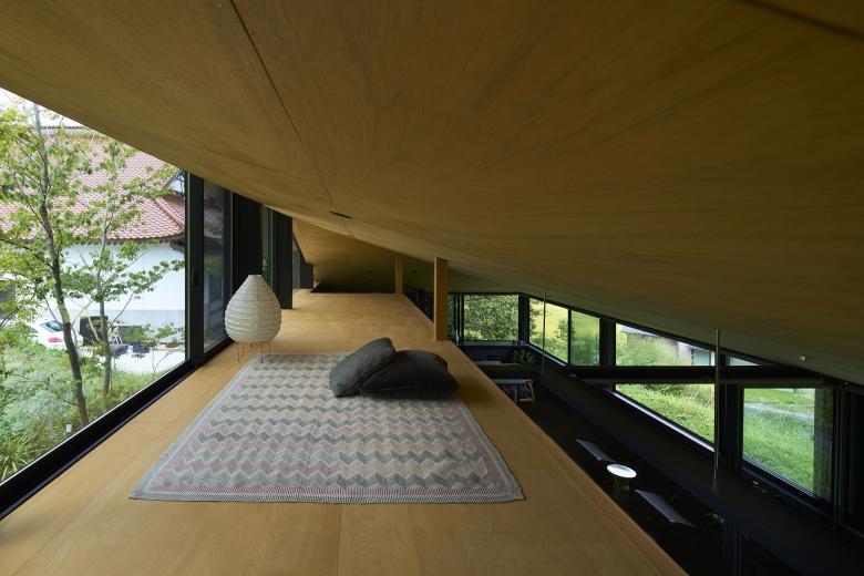 The LDK and bedroom are fitted with a series of connected windows that respond to the surrounding landscape. Low walls beneath the windows provide both openness and a calm sense of inwardness. In the loft, a large opening not only frames the view but also creates a place to spend time while gazing at the mountain ridges and the moon. These windows serve not only for daylight and views, but also as paths for airflow, allowing breezes that sweep across the hilltop to pass through the house.