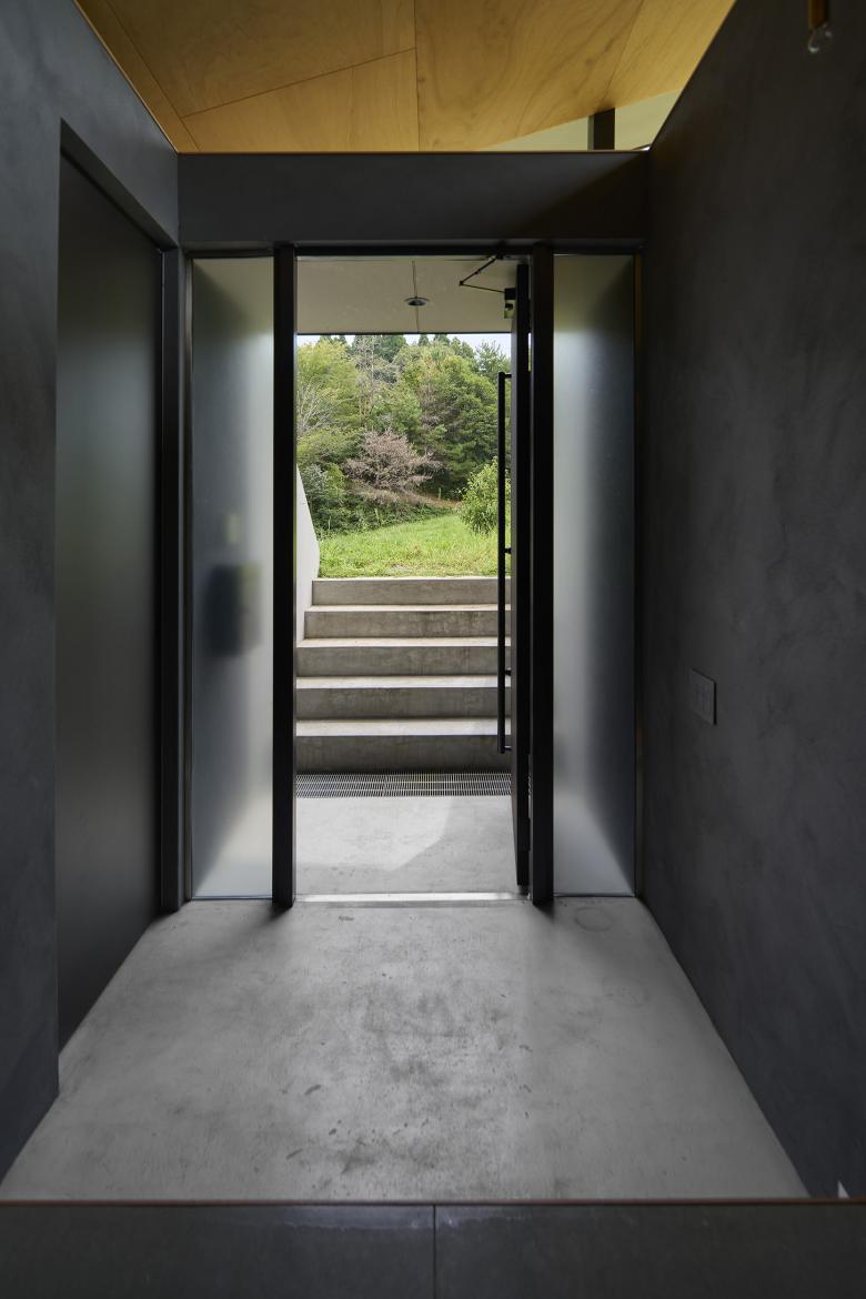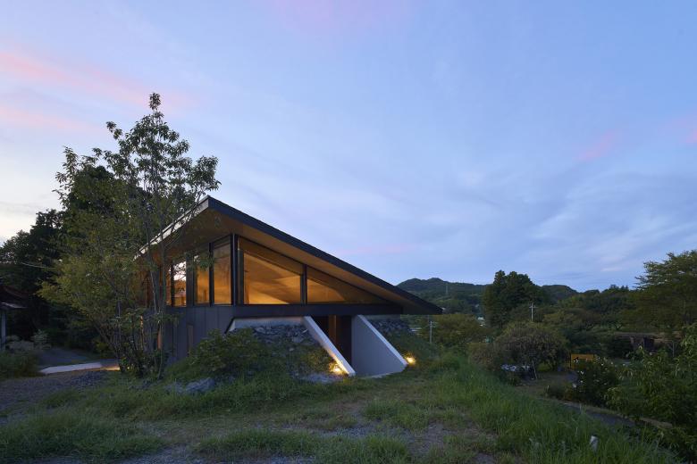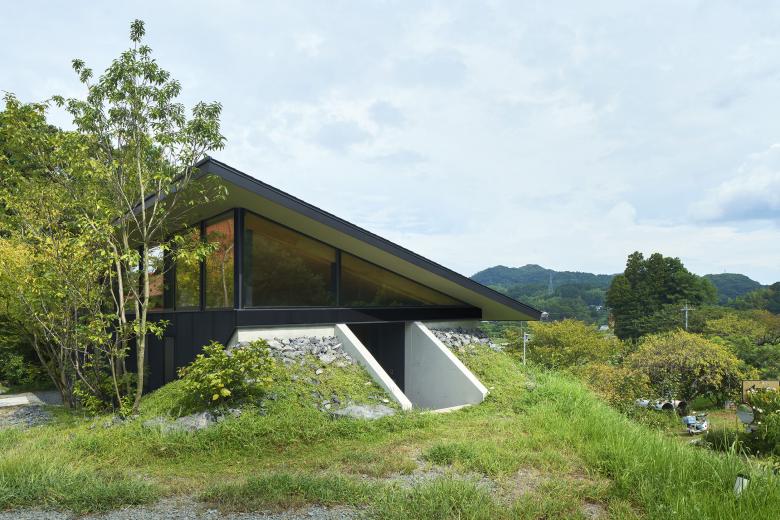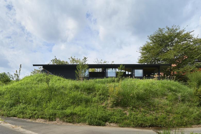 This house was planned in Ōda City, Shimane Prefecture, in a tranquil setting near the Iwami Ginzan Silver Mine, where gentle hills unfold amid a rural landscape. The site is shaped like a small hill, with its crest divided into two levels—an upper and a lower terrace. Rather than leveling this distinctive topography through earthwork, the design embraces the natural undulations of the hill, spanning them with a single, large roof.