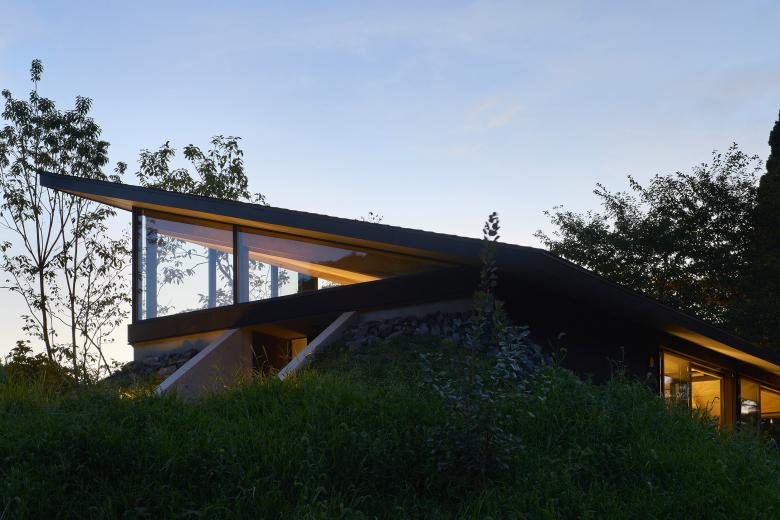 Over time, the vegetation on the hill will grow and gradually envelop the base of the building in greenery. The architecture will come to settle into the land, forming a scene as if a large roof had been gently placed upon the hill itself.