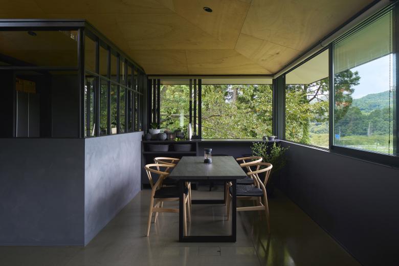 The building is a single-story residence for a couple, conceived as a continuous space containing a variety of places to inhabit. While areas are separated by glass, sightlines and light gently interweave, and variations in ceiling height and the placement of openings lend each zone its own character.