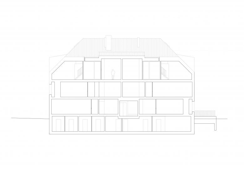 Das Wohnhaus in seiner heutigen klassischen Erscheinung und einem einfach strukturierten Grundriss bietet Platz für 12 Einheiten mit den unterschiedlichsten Wohnqualitäten. Die 4-Spännertypologie nutzt das Bauvolumen optimal aus und schafft attraktive Kleinwohnungen, orientiert nach den Himmelsrichtungen und den ortsspezifischen Gegebenheiten (Aufenthalts- und Spielstrasse, Gleisanlage oder innenliegender halbprivater Gartenbereich). Die Tiefgarage bietet Raum für 15 Parkplätze und genügend Abstellmöglichkeiten für Velos und e-Bikes.