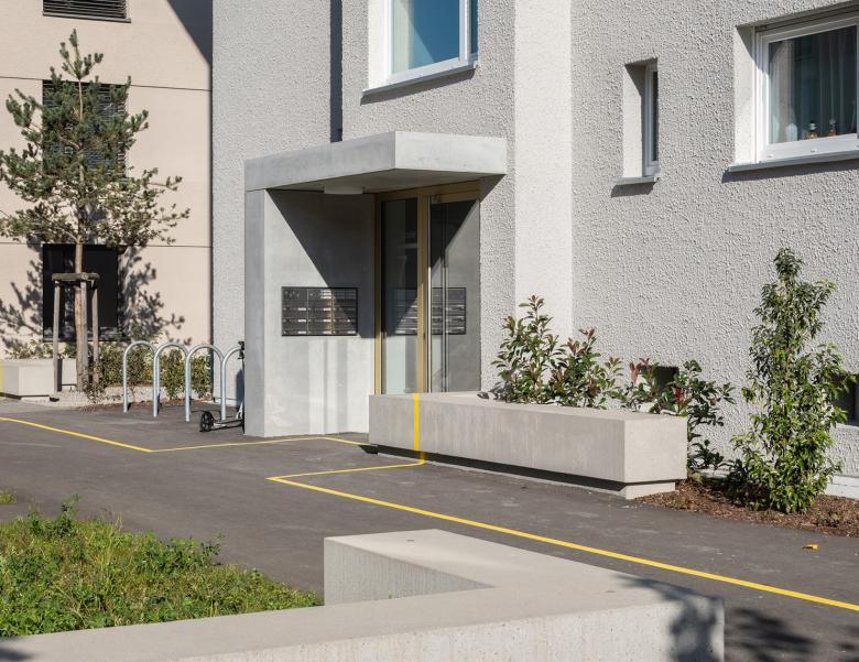 Die Balkone wurden deutlich vergrößert und thermisch entkoppelt. Outdoor-Vorhänge bieten sowohl Sonnen- als auch Sichtschutz. Für die Hochparterre-Wohnungen entstanden zudem direkte Zugänge zu privaten Gartenbereichen. Auch die gemeinschaftlich genutzten Bereiche wie Hauseingänge und Treppenhäuser wurden funktional und gestalterisch neu organisiert. Die Eingangssituationen erhielten Betonwinkel und Sitzelemente. Ergänzend dazu wurde das Freiraumkonzept überarbeitet und die Außenanlagen neugestaltet, um die Aufenthaltsqualität im Quartier insgesamt zu stärken.