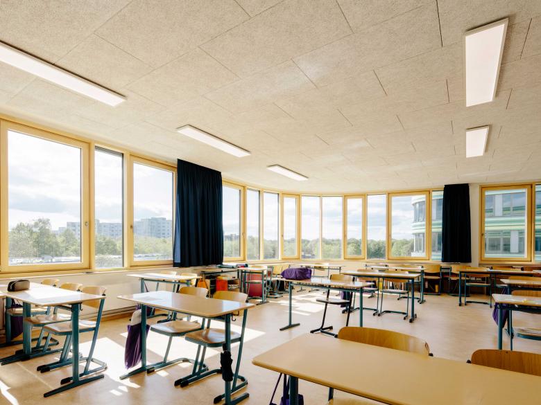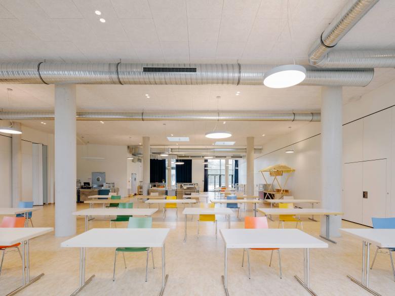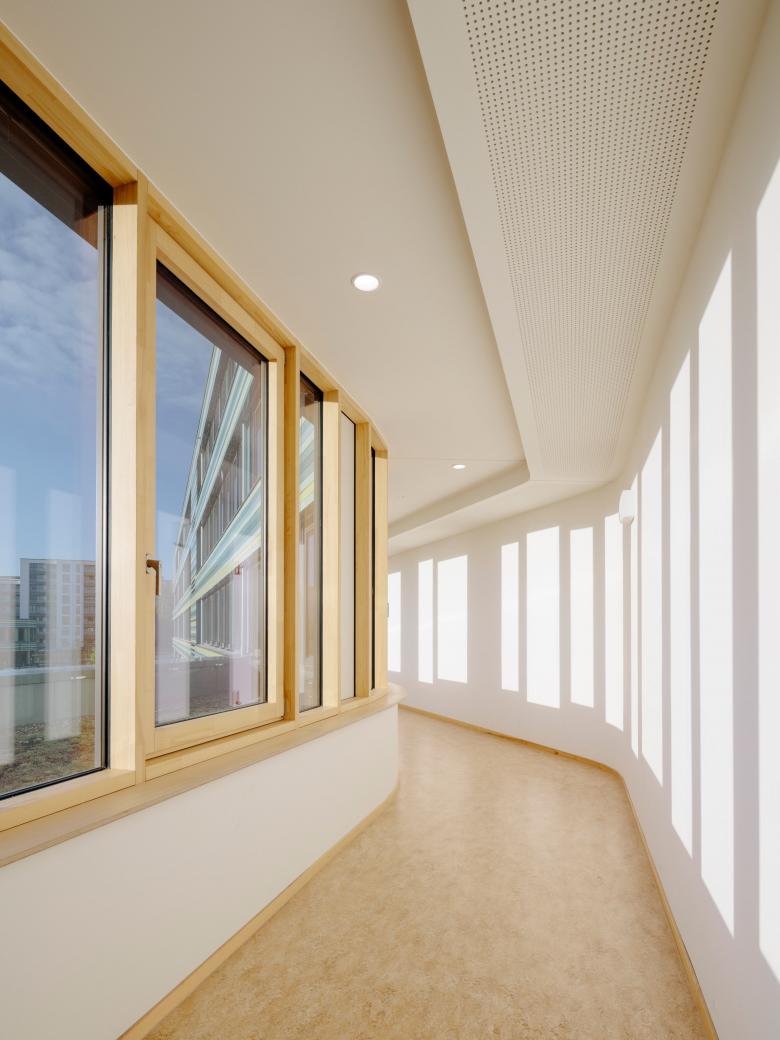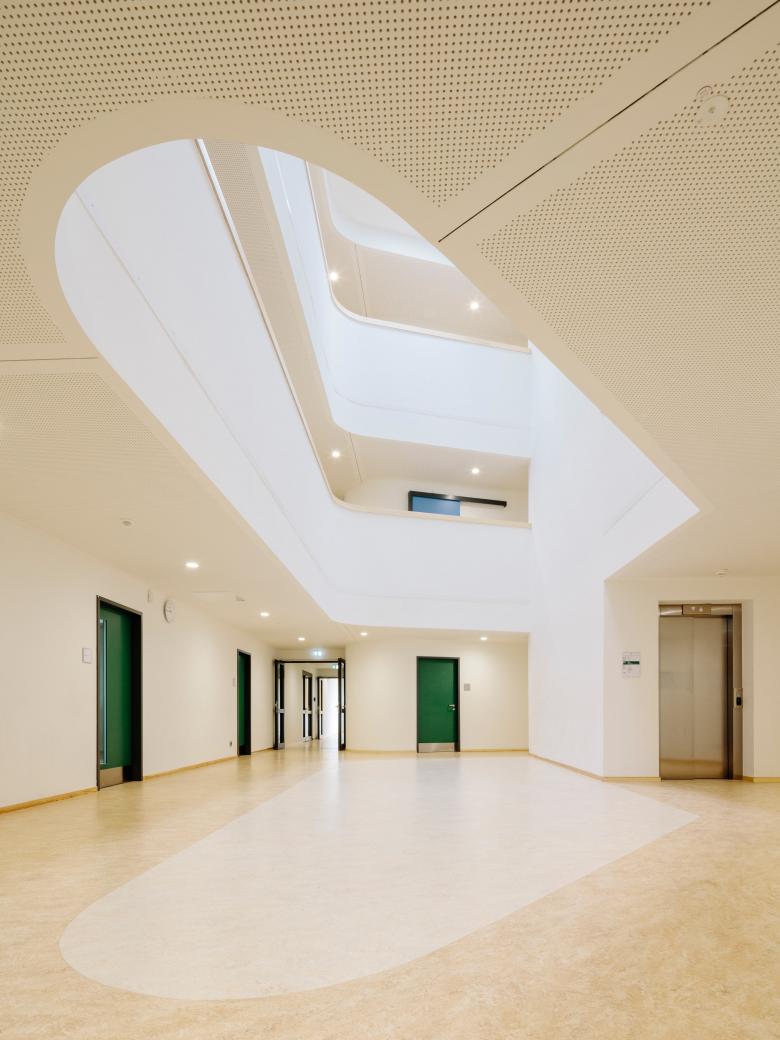 Der Neubau des Campus Steilshoop vereint auf 12.800 Quadratmetern nicht nur Grund- und Stadtteilschule unter einem Dach, sondern wagt mit der Integration des Quartierszentrums im zweiten Gebäudekomplex einen bedeutungsvollen Neuanfang. Neben der Grund- und Stadtteilschule »Schule am See« finden hier nämlich auch die Bücherhalle, die Volkshochschule, die Elternschule Steilshoop und das Haus der Jugend ihren Platz, an dessen Ort vorher der sogenannte »Betonriegel« aus den sechziger Jahren zunehmend zum Kern des Problemviertels wurde.