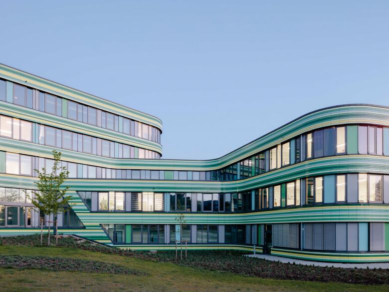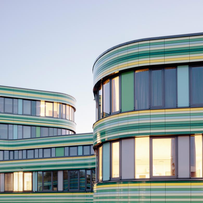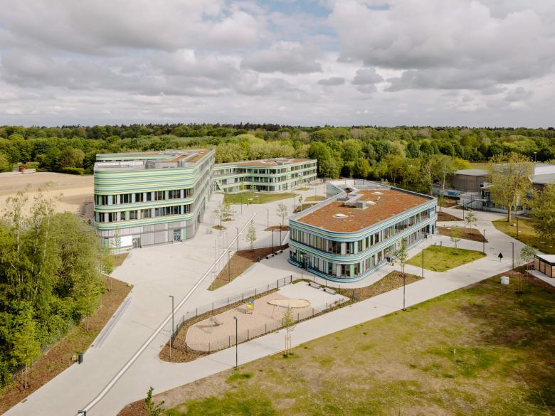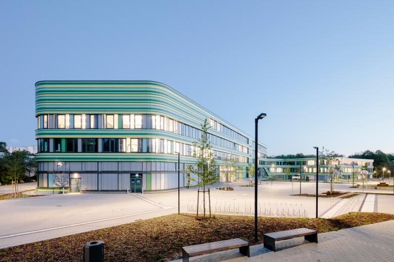 Das Ensemble aus zwei Baukörpern schmiegt sich um eine platzartig aufgeweitete Campus-Achse, die sowohl eine Öffnung zum Stadtteil als auch eine Sichtachse zum Bramfelder See herstellt. Die weiche Kubatur der zwei- bis viergeschossigen Gebäude ist mit umlaufenden Bändern aus farbiger Keramik umhüllt. Großzügige Verglasungen sorgen für maximale Transparenz und Ein- und Ausblicke, um die Funktionen innerhalb der Gebäude mit der Außenwelt zu verbinden.