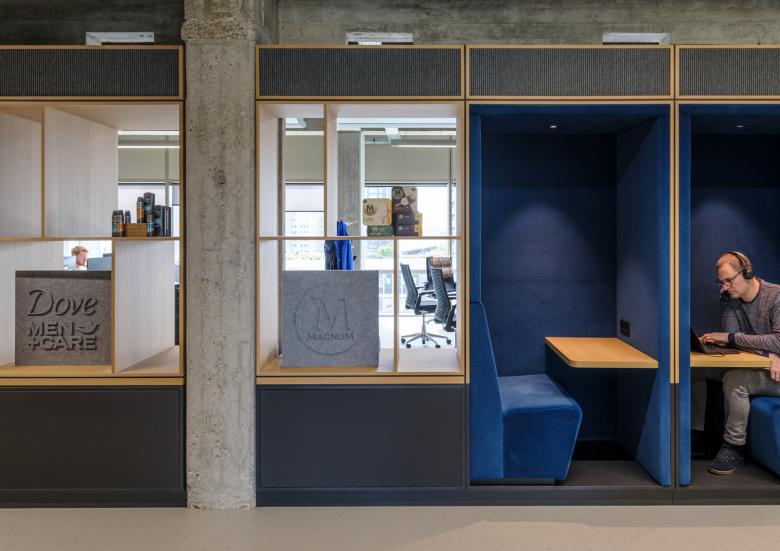 These serve as Unilever’s internal showcase. Products can be displayed in the cabinets and they can also be used for calls, discussions or to work in silence.
