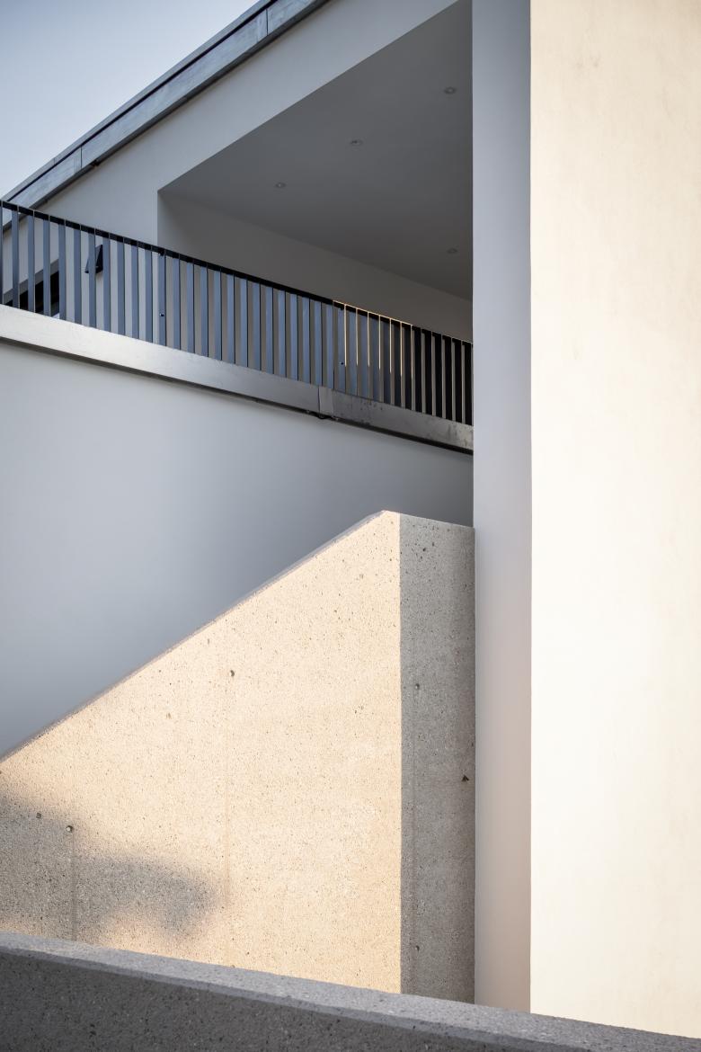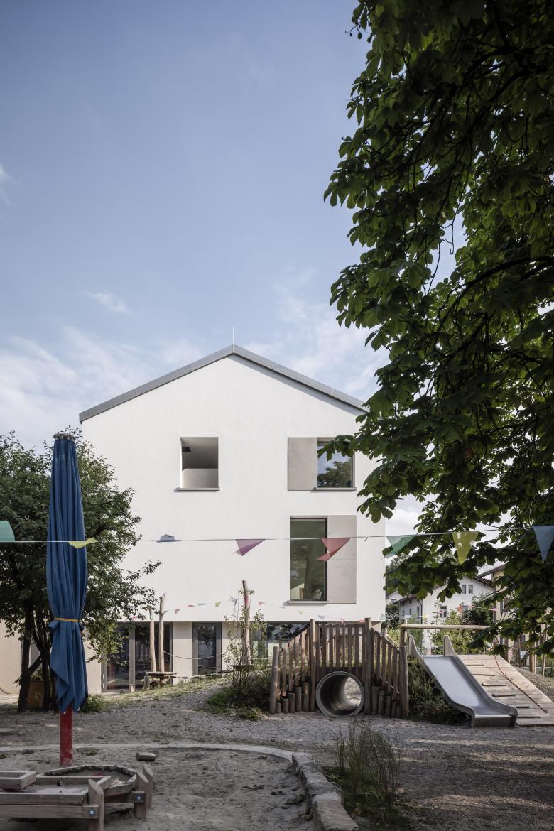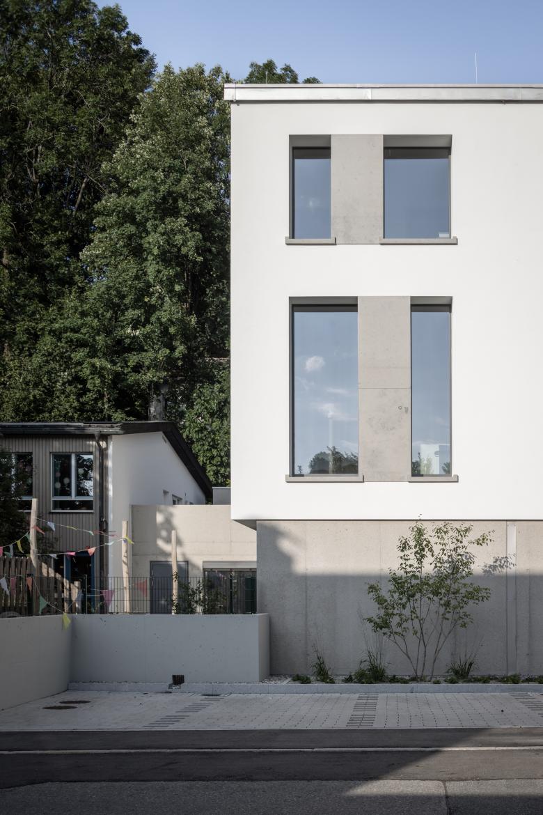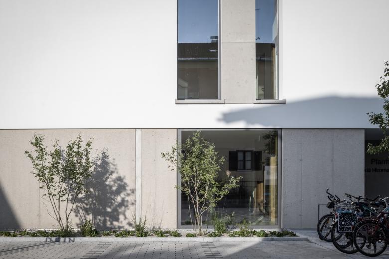Solide und erhaben präsentiert sich das Gebäude aus Stahlbeton mit drei Geschossen. Es befindet sich an einem Hang im Zentrum von Miesbach – eine Lage, die einige Herausforderungen, aber auch Chancen mit sich brachte. Um alle Nutzungen des Pfarrheims – Treffpunkt der Gemeinde und vieler anderer kirchennaher Vereine in Miesbach – unterzubringen, dabei aber das Volumen nicht allzu groß werden zu lassen, wurde ein Flachdachbaukörper von Osten in das Satteldachgebäude hineingeschoben. Dieser Kniff erwies sich als mehrfach günstig, da dadurch auch ein großzügiger Platz zum Hang hin entstand, der zudem vom angrenzenden Kindergarten mitgenutzt wird. Ein dezenter Dachüberstand, bodentiefe Fenster sowie ein minimal nach innen abgesetzter Sockel lassen die Fassade lebendig erscheinen. Die historische Statue des Heiligen Josef mit Jesuskind hat einen prominenten Platz an der Westfassade des Hauses erhalten und spielt mit dem Kontrast aus Modernität und Tradition. Von seiner Setzung her greift das zur Kolpingstraße ausgerichtete Haus die Formen der umgebenden Häuser mit ihren Giebeln und Kanten auf.