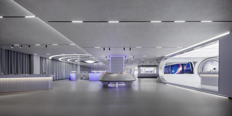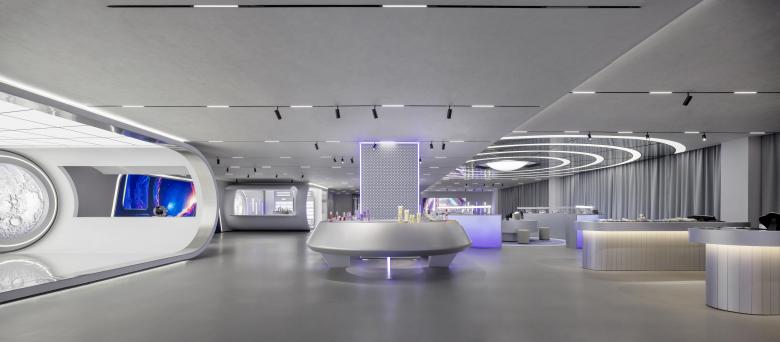 整体以白、紫、银灰为主色调。白色与紫色组合,用于线性灯带,带来神秘、奇幻的未来感,契合宇宙探索主题。银灰色作为 “太空舱体验区” 金属材料的主色,折射冷冽光芒,营造出科技感和冷峻的太空氛围,与灯带的紫色、白色相互映衬,共同构建出充满科幻魅力的展示空间,让参观者充分感受未来与宇宙元素交织的独特魅力。