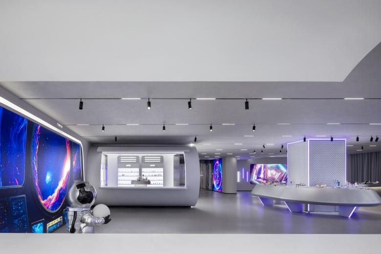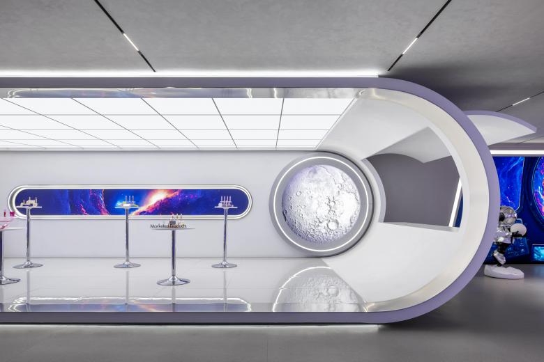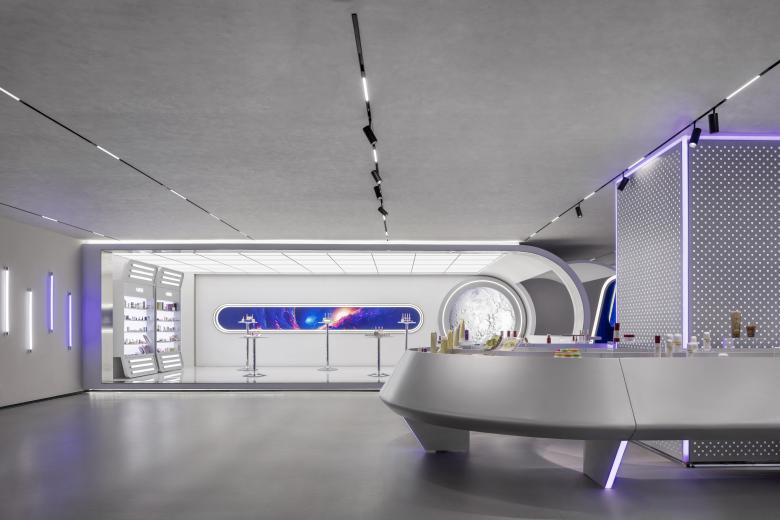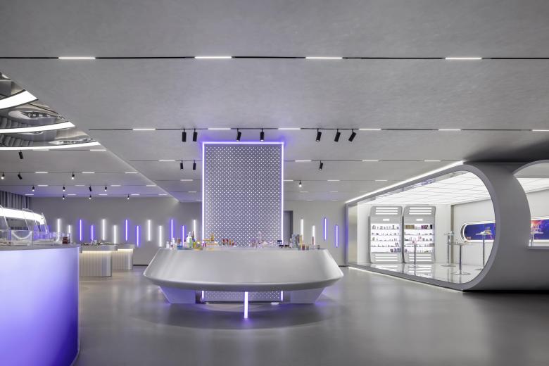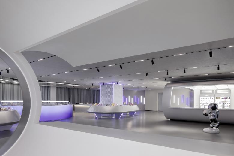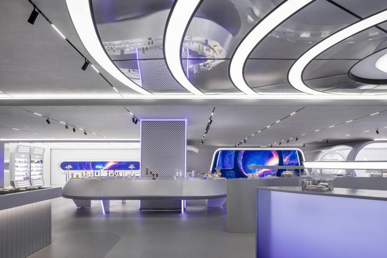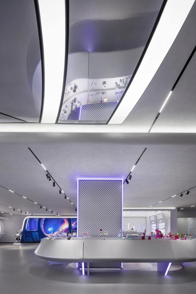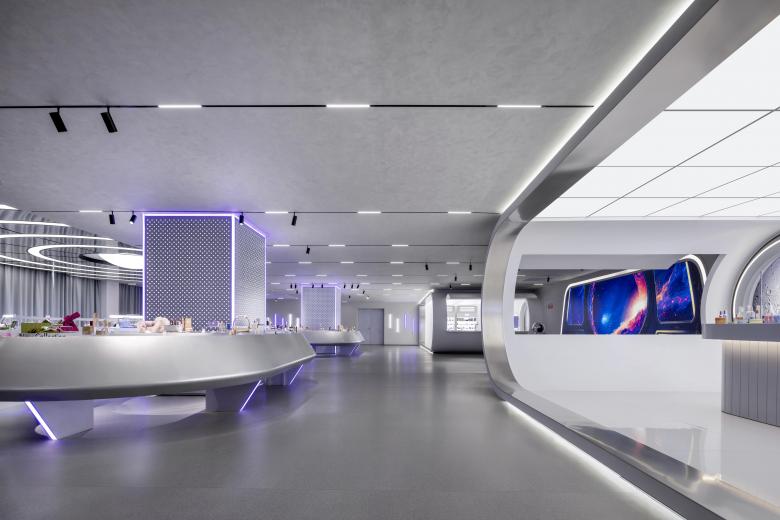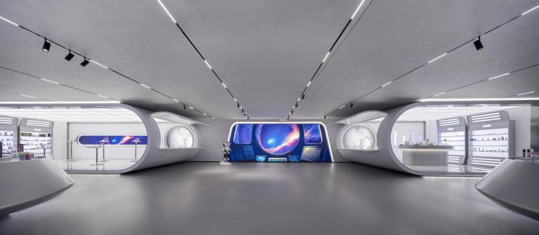 在灯光营造方面,巨大显示屏展示广袤宇宙,配合白紫相间的线性灯带,像跳动的星系,瞬间将人带入未来时空;“太空舱体验区” 的环形灯带搭配银灰色金属材料,LED 灯如璀璨星河,增添梦幻感。空间构建上,化妆实验舱的弧形设计搭配网格拉膜天花,模拟太空舱环境;实验舱的观察窗,透出的真实世界与宇宙奇观形成对比,增加空间层次,以往商品陈列区的传送带元素模拟物资运输,兼具功能与科技感。