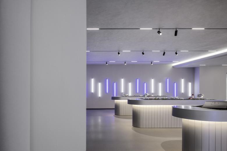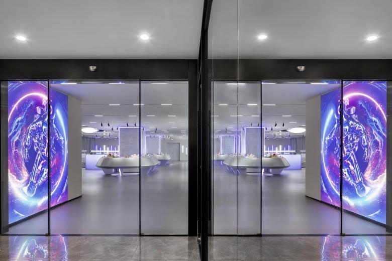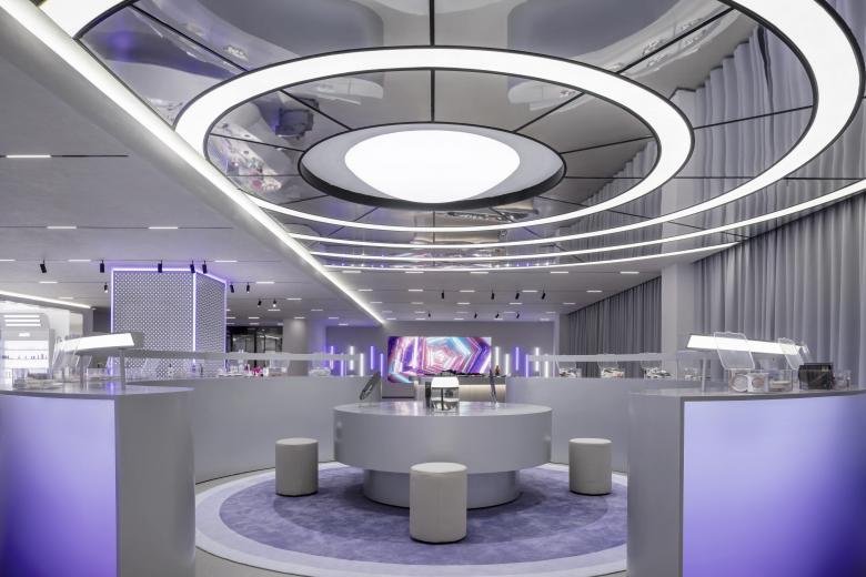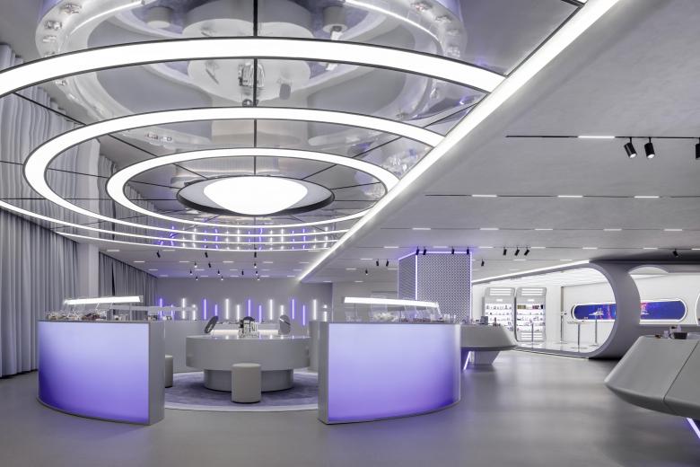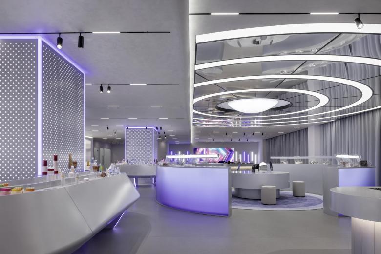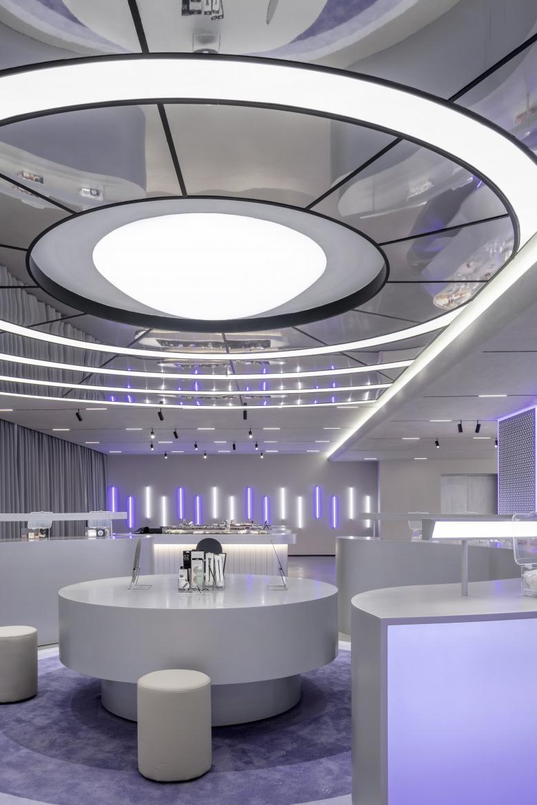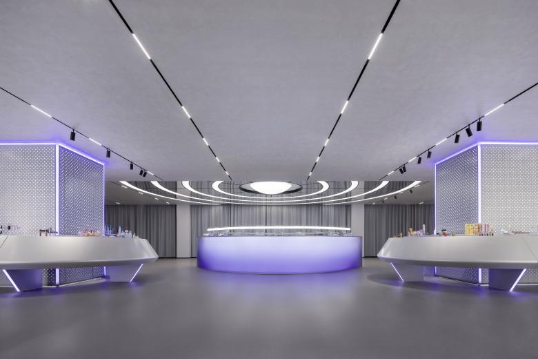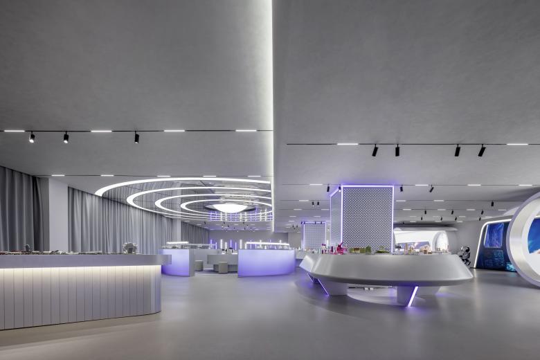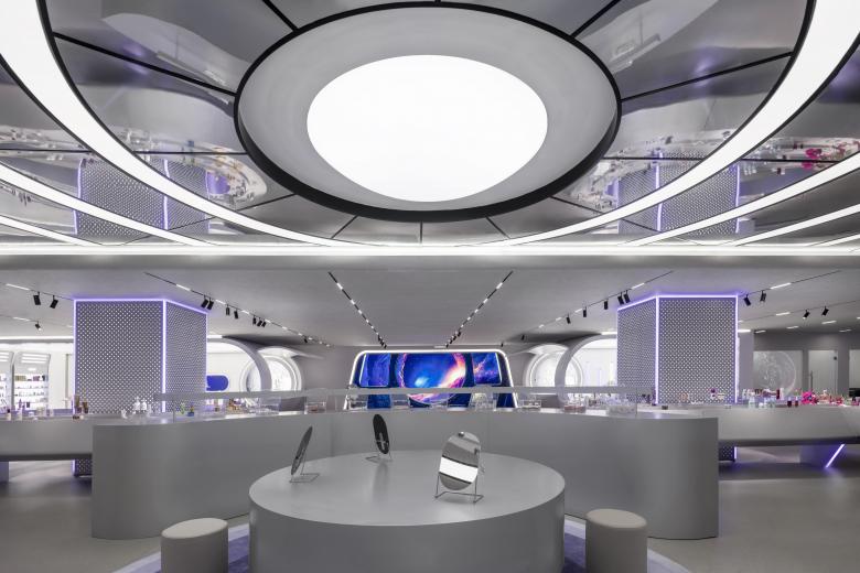 在灯光营造方面,巨大显示屏展示广袤宇宙,配合白紫相间的线性灯带,像跳动的星系,瞬间将人带入未来时空;“太空舱体验区” 的环形灯带搭配银灰色金属材料,LED 灯如璀璨星河,增添梦幻感。空间构建上,化妆实验舱的弧形设计搭配网格拉膜天花,模拟太空舱环境;实验舱的观察窗,透出的真实世界与宇宙奇观形成对比,增加空间层次,以往商品陈列区的传送带元素模拟物资运输,兼具功能与科技感。