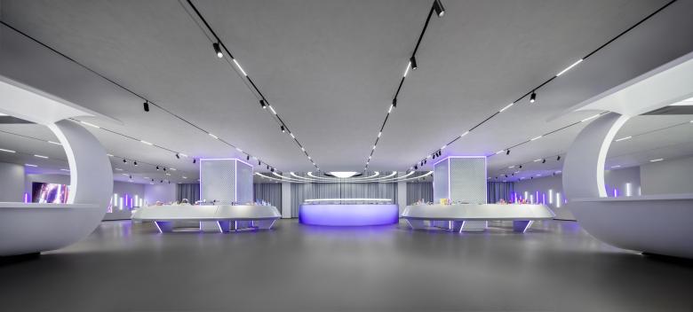 “天地玄黄,宇宙洪荒,日月盈昃,辰宿列张。”,人们从古至今,从未停止过对宇宙时空的探索,宇宙的未知性与神秘性使得它成为了人们对未来的探索路径之一。展示着广袤无垠宇宙的巨大显示屏,白紫相间的线性灯带犹如跳动着的不规则星系将旅客们从打开电梯门的一刻瞬间便拉入到未来时空的旅途当中。在安特未来灵感舱来一场穿越星际的未来探索,融入全新的科技元素,结合化妆品展厅打造了一个沉浸式未来风格的感官盛宴。