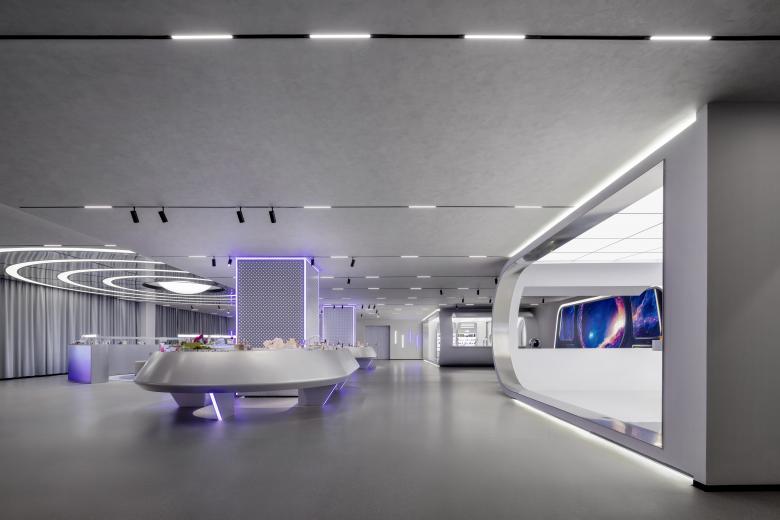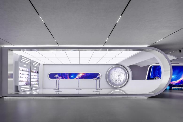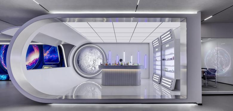 安特未来灵感舱化妆品展厅位于江苏省苏州市高新区占桥头街 89 号,2024年完工,建筑面积 500㎡,是苏州安特化妆品股份有限公司的创新展示空间。安特未来灵感舱化妆品展厅的设计概念,以 “穿越星际探索未来” 为主题线索,以创新的设计理念,融合全新的科学技术与美学,打造出沉浸式的未来风格体验空间。