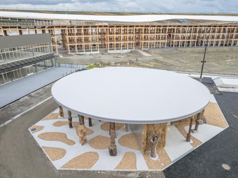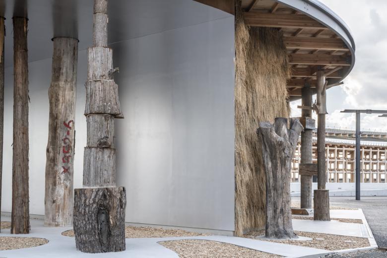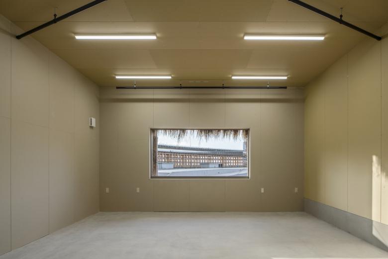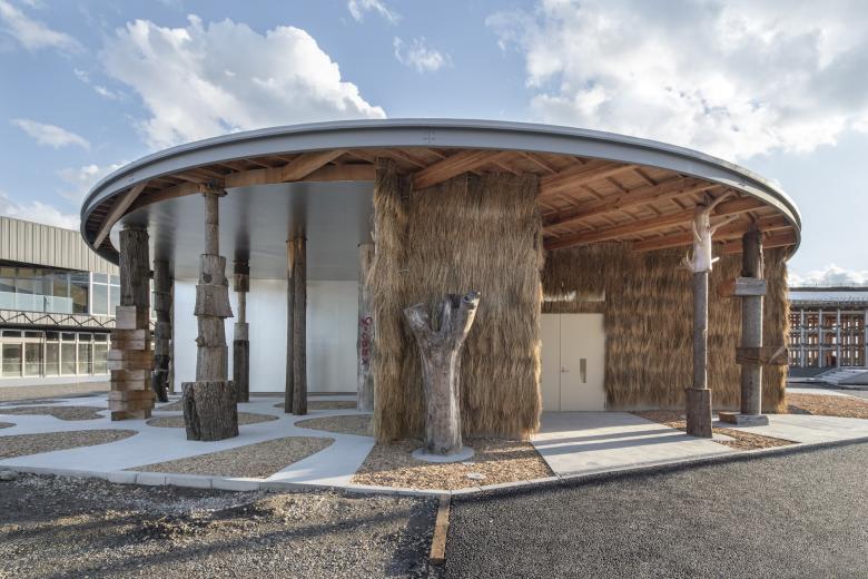 壁材には「苫編み」という技法で編んだ稲わらを取り付けた。外壁に求められるのは耐久性である。しかし苫は1年で更新されるような材料で、現代の材料とは真逆の特徴を持つ。半年という会期だからこそたどり着いた材料だ。また茅葺きの葦は取得が簡単にはできないが、稲わらは日本全国どこからでも毎年手に入るお手軽材料である。苫を今後も外壁として提案し続けるわけではないが、素材の寿命やサイクル、入手といった経路についても考えを改めるきっかけとなった。