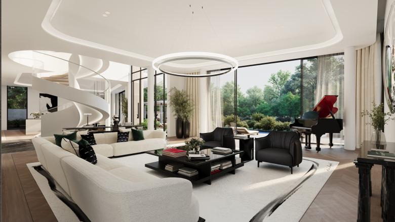 Inspired by his affinity for 18th-century architecture and Art Deco elements, the villas reinterpret historical proportions through a modern lens. The design follows a structured hierarchy—with floor heights decreasing as they ascend—creating a sense of balance and weight that anchors the space. The grand arrival sequence draws from Karl Maison’s elevated plinth and archway, establishing an entry experience that exudes both sophistication and openness.