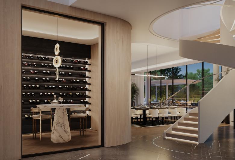 At the heart of the design is the catwalk—a defining feature inspired by Lagerfeld’s legendary shows. Each villa opens onto a personal runway, with experience zones flanking either side and culminating in a spiralling staircase that serves as a sculptural focal point.