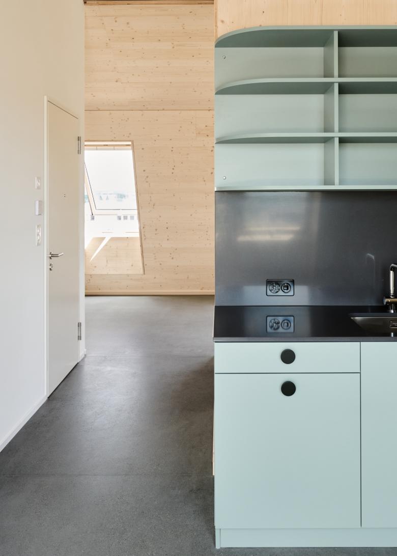 Die beiden Gebäude wurden um zwei Geschosse in Holzrahmenbauweise aufgestockt – eine ressourcenschonende, leichte Bauweise, die sich optimal für die Bestandsstruktur eignete. Die neuen Dachgeschosse orientieren sich in ihrer Organisation am Bestand und nutzen die vorhandenen Platzverhältnisse effizient.