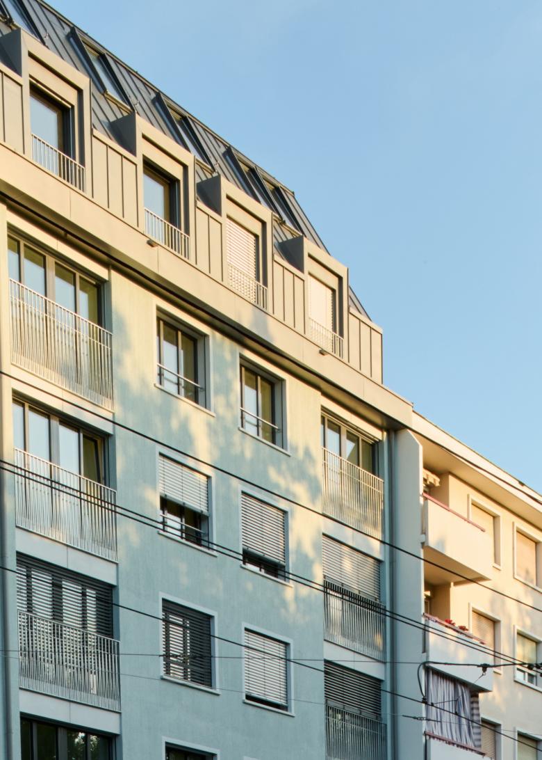 Die Fassadengestaltung übersetzt die ursprünglichen Stein-Fenstereinfassungen in Putzfaschen und schafft so eine subtile Verbindung zwischen Alt und Neu. Die metallische Hülle der Aufstockung bildet einen klaren oberen Abschluss und verleiht den Gebäuden eine neue Identität.