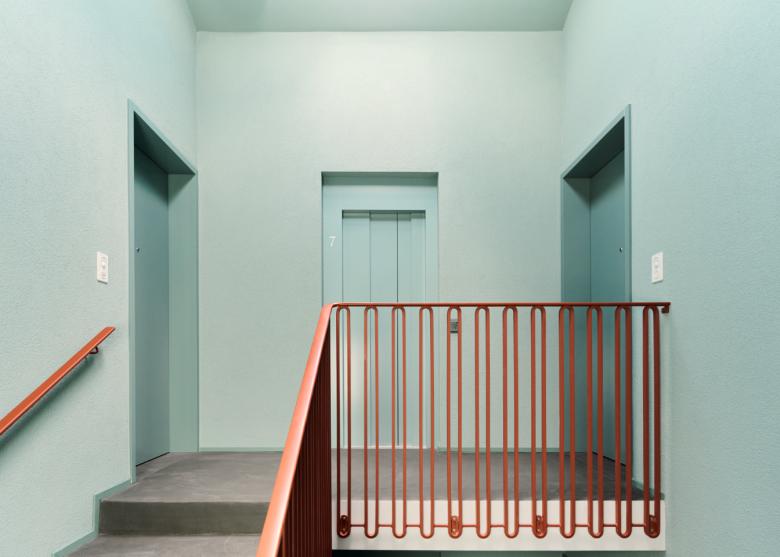 Die Balkonschicht auf der Hofseite, ausgeführt mit Stahlstützen und Ortbetonplatten, bietet zusätzliche Aufenthaltsqualität und verbindet Altbau und Aufstockung auf selbstverständliche Weise. Der Rückbau der massiven Balkone zur Strassenseite verbesserte zudem die Belichtung der Innenräume.