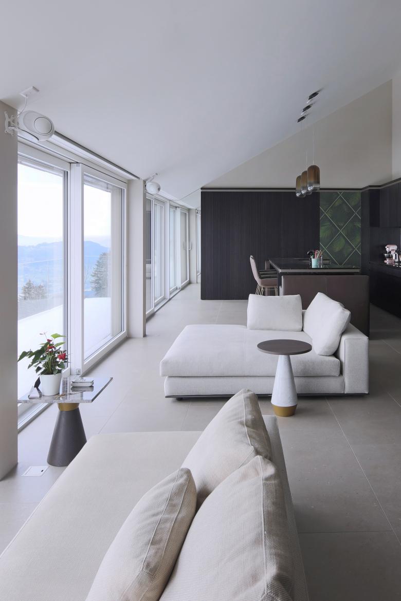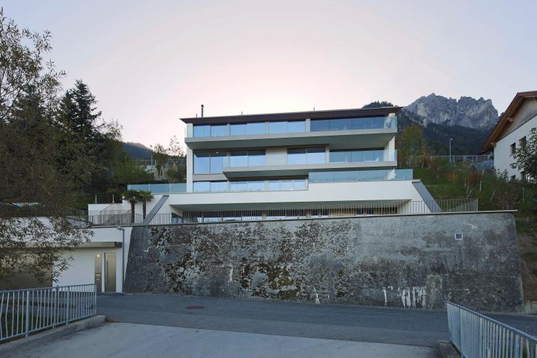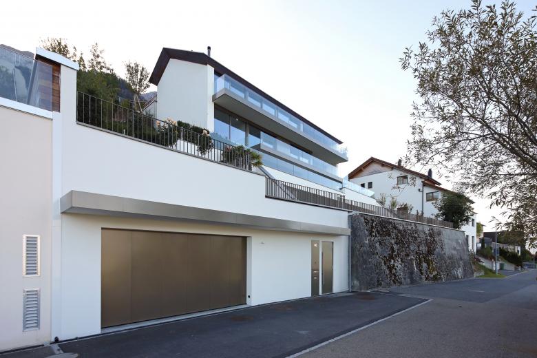 Aufgrund von Dimension und Topographie zeigten sich zahlreiche Herausforderungen. Ein gesamter Aushub der Parzelle mit einer Tiefe von 20 Metern war nötig um dem Wunsch der maximalen Ausnutzung nachzukommen. Die Architektur ist von durchgängig raumhohen Fenstern talseitig geprägt. Im obersten Stock befindet sich eine Attika welche als Gästeeinheit oder vollständig getrennt genutzt werden kann.