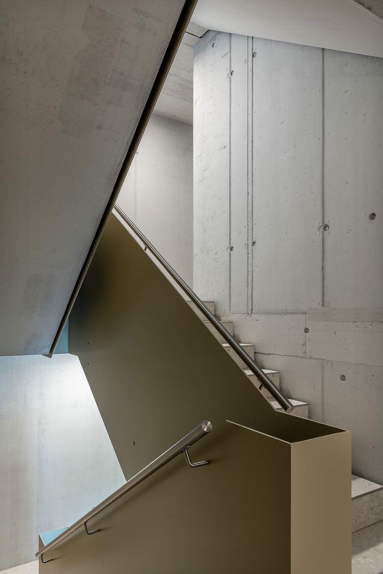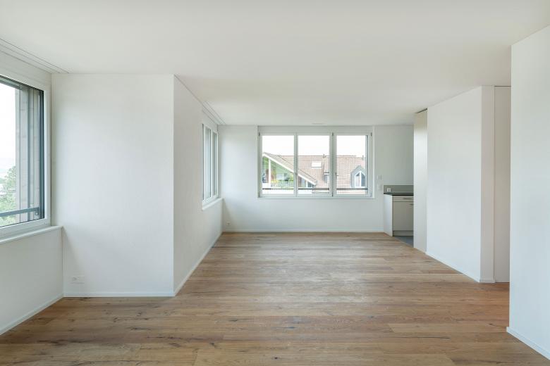 Die erhöhte Lage des Grundstücks ermöglicht nordseitig einen Blick bis ins Dorfzentrum sowie südseitig eine freie Sicht auf die angrenzende Landwirtschaftszone. Als Siedlungsauftakt sowie auch als Abschluss, bekommt die Bebauung eine prominente Doppelfunktion. Der Übergang von der Wohn- in die angrenzende Landwirtschaftszone beeinflusst die Setzung sowie die architektonische Gestaltung des Neubaus massgeblich. Der Zeilenbau reagiert mit seiner einfachen und klaren Grundform auf die umliegende Siedlungsstruktur. Den benachbarten Quartierbauten verwandt, wird die längliche Volumetrie der Zeile durch einen Versatz leicht strukturiert. Die beiden aneinandergereihten Zweispänner werden mit unterschiedlichen Wohnungstypen bespielt. Alle Wohnungen weisen grosszügige und gut möbelierbare Grundrisse auf und sind durch die Reduktion von Korridorflächen sehr effizient organisiert. Das Grundstück wird durch den Zeilenbau in eine Nord- und Südseite unterteilt. Talwärts entwickelt sich in nördlicher Richtung der gebaute Siedlungskontext, wohingegen in südlicher Richtung die Landwirtschaft dominiert. Das Umgebungskonzept reagiert auf die unterschiedlichen Einflüsse der angrenzenden Aussenräume.