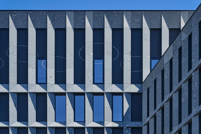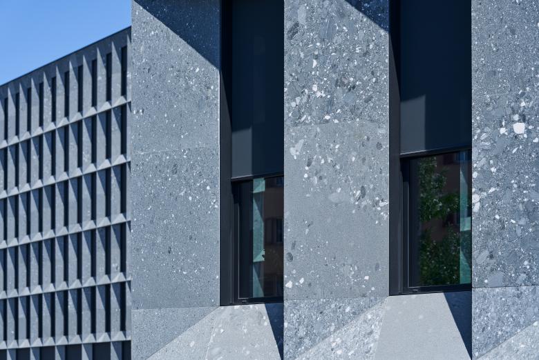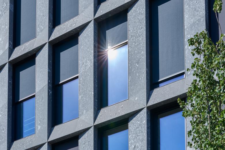 Je nach Tageszeit sind die Vertikalstoffstoren mehr oder weniger im Einsatz. So verdecken sie an einem sonnigen Tag auf den der Sonne zugewandten Gebäudeseiten sämtliche Öffnungen; auf anderen Seiten sind sie nur vereinzelt heruntergefahren, und auf den nicht besonnten Fassaden sind sie ganz in der Leibung der schwarzen Metallrahmen versenkt und geben die Fenster frei. Zur abwechslungsreichen Optik der von der Hohlstrasse einsehbaren Fassaden tragen zum einen die Stoffstoren und Glas bei und zum anderen das Baumaterial selber. Die Architekten wählten den grüngrauen Walliser Naturstein Verde Salvan. Mit seinen unterschiedlich grossen Einschlüssen und Farbnuancierungen erzeugt das Sedimentgestein ein lebendiges Bild. Aus der Ferne wirkt es homogen, erst aus der Nähe wird seine Vielfalt deutlich. Die Vertikalstoffstoren stehen im Einklang mit dem Grüntouch der Fassadenplatten. Sie sind in Charcoal gehalten – einem Farbton, der sich zwischen Dunkelgrau und Schwarz bewegt. Beim Stoff selber handelt es sich um einen Screen-Stoff, der einen ausgezeichneten Wärmeschutz aufweist und eine klare Sicht nach draussen bietet. Zusätzlich zu den 3'200 Vertikalstoffstoren produzierte Schenker Storen 300 Rafflamellenstoren des Typs KR 80 für jene Fenster, welche die sieben Innenhöfe flankieren. Funktionalität und Ästhetik stehen in Einklang zueinander und geben dem PJZ eine starke Präsenz mitten in Zürich.