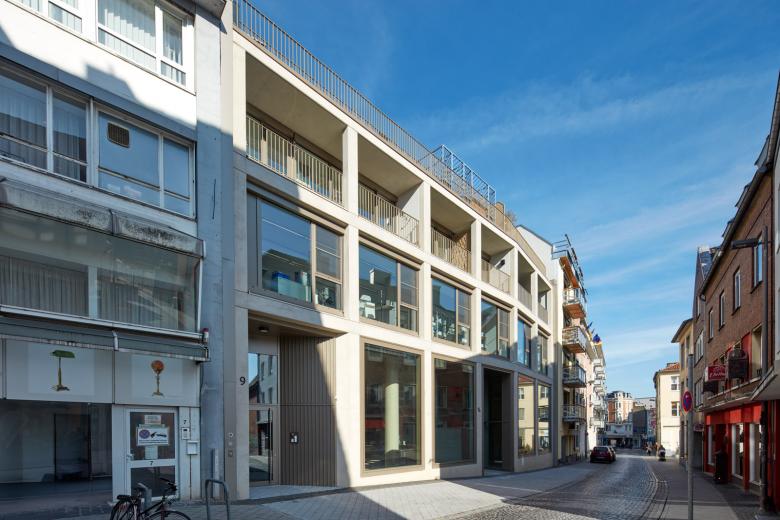 Der Neubau umfasst im Erdgeschoss eine Verkaufsstätte, die sowohl von der Großkölnstraße als auch Kleinkölnstraße zugänglich ist. Über der Verkaufsstätte gibt es 21 Wohnungen. Die übrigen Flächen werden als Büroräume genutzt. Um für ausreichend Belichtung und Belüftung der Wohnungs- und Büroflächen zu sorgen, wurde ein großzügiger Innenhof geplant. Die Fassadensprache entlang der Straßen nimmt die Struktur der 50er Jahre Nachbargebäude und der gegenüberliegenden gotischen Kirche in Form einer sichtbaren tragenden Skelettstruktur aus Sichtbeton auf. Das besondere hierbei ist, dass die Fassade nicht vorgehängt, sondern Teil der Tragstruktur ist.