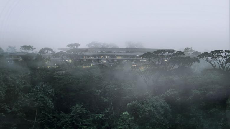 Der Wunsch, das Projekt zu verbergen und zu tarnen (so wie ein Tier oder Insekt sich in seiner Umgebung tarnt), führte dazu, dass die Bauten um bestehende Bäume herum und zwischen ihnen platziert wurden – ihre Formen folgen den Konturen des Geländes und schaffen Räume, die sich im Einklang mit den Rhythmen der Natur bewegen. Wir haben bewusst die Grenzen zwischen Menschgemachtem und Natur, Innen und Außen verwischt, sodass die Gebäude wie natürliche Erweiterungen des Dschungels erscheinen.