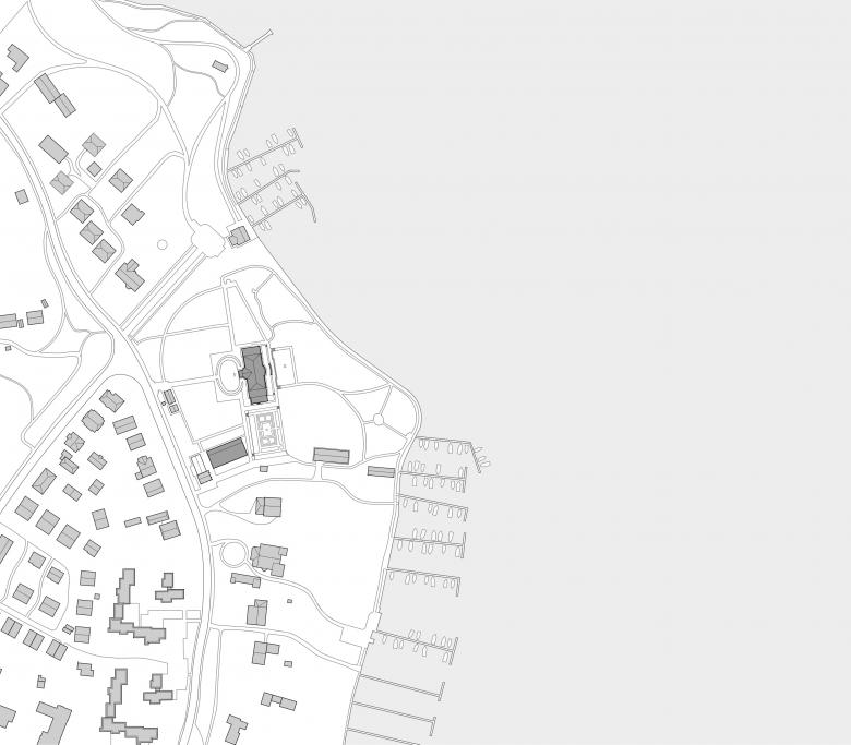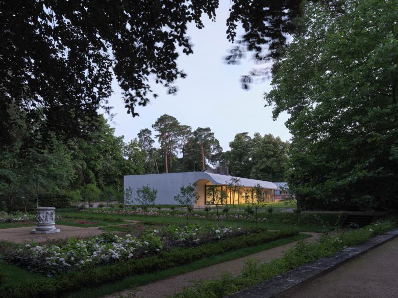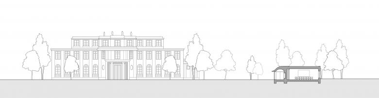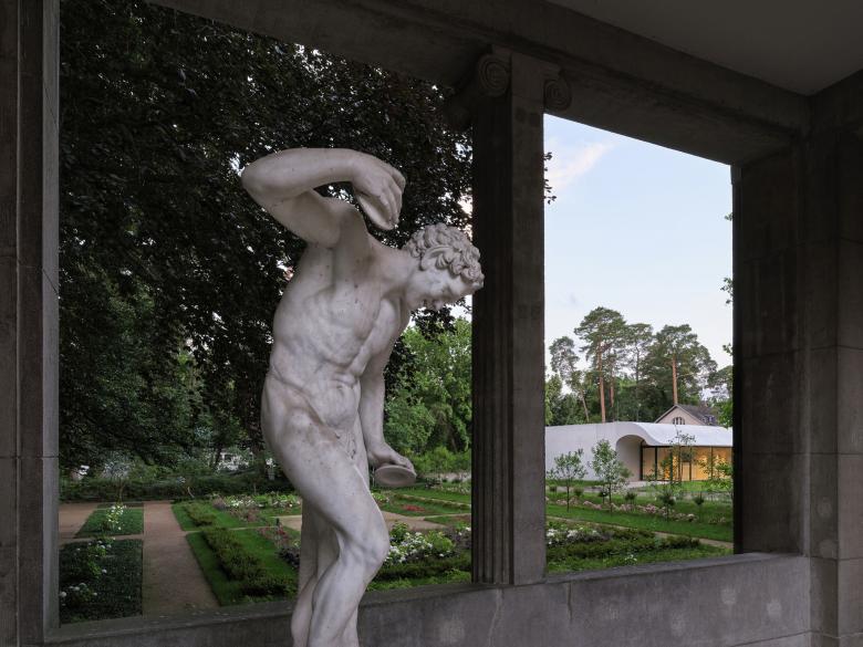 Das zwischen dem ehemaligen Gärtnerhaus und dem Rosengarten gelegene Gebäude begrenzt den Garten der Villa nach Süden. Der dreiseitig umschlossene Baukörper öffnet sich mit einem gläsernen Foyer zum Haupthaus und bindet mit einem ausschwingenden Vordach die an beiden Seiten ankommenden Gartenwege ein. Der Schwung des Daches vermittelt zwischen dem zur denkmalgeschützten Anlage hin zurückhaltenden Erscheinungsbild des Seminargebäudes und der erforderlichen Raumhöhe für die Konferenznutzung im Inneren. Gleichzeitig gibt die plastische Ausformulierung des Daches dem Bau ein unverwechselbares Gesicht.