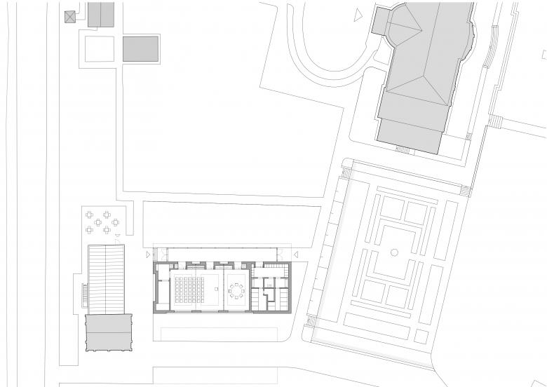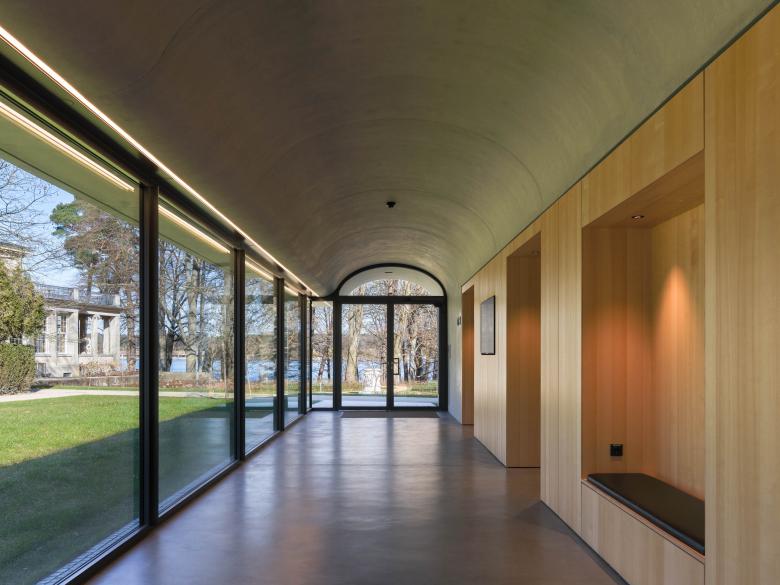 Das raumhoch verglaste Foyer dient als Treffpunkt und Aufenthaltsbereich, der von der Sichtbeziehung zum Originalschauplatz lebt. Im Kontrast dazu wird der dahinter liegende Konferenzbereich von einer konzentrierten Atmosphäre bestimmt. Der zweifach teilbare Raum erhielt eine hölzerne Raumschale, in die Raumteiler, Einbaumöbel, Sonnenschutz, Licht- und Medientechnik integriert sind. Nebenraumzonen fassen den Konferenzbereich an den Seiten. Sie sind wie die Rückfassade in Sichtbeton ausgebildet und geben dem Gebäude einen festen Rahmen, aus dem sich das markante Vordach in Richtung Garten schwingt.