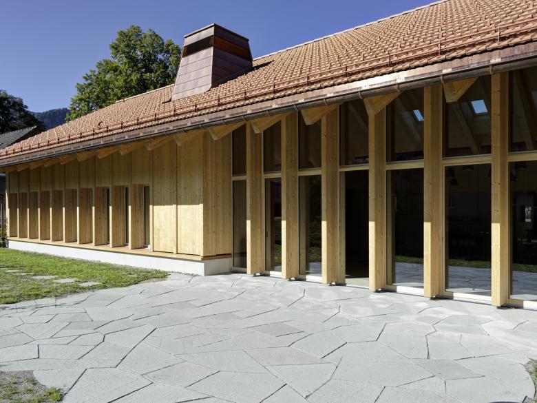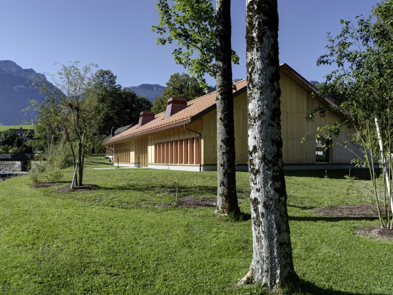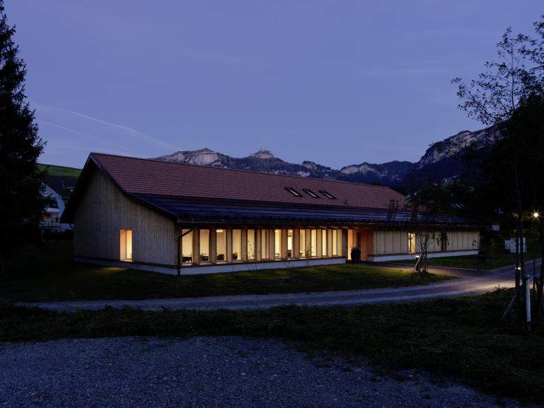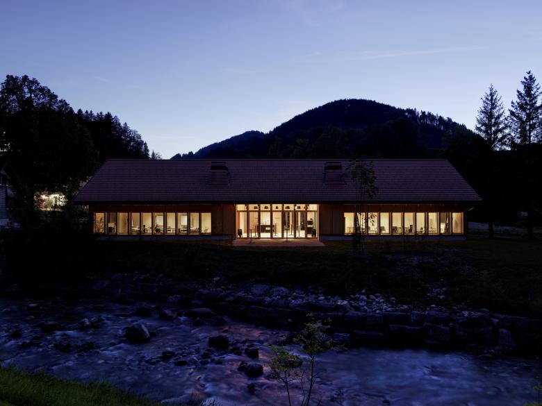 Das gefaltete Sparrendach fasst die unterschiedlichen Nutzungen zusammen. Die Vor- und Rücksprünge des Hauptvolumens lassen die vier Raumgruppen auch von aussen erkennen. Die beiden Säle überspannen das Foyer und orientieren sich zum Bach, die Gruppenräume und die notwendigen Wirtschaftsräume liegen auf der Nordseite. Die raumhohe Verglasung zum Schwendebach bringt die charakteristische Appenzeller Landschaft bis im Foyer zur Geltung.