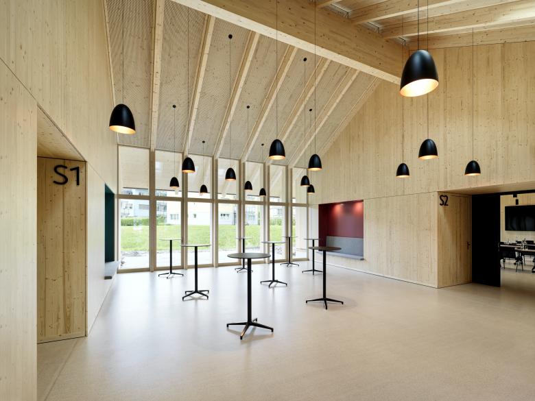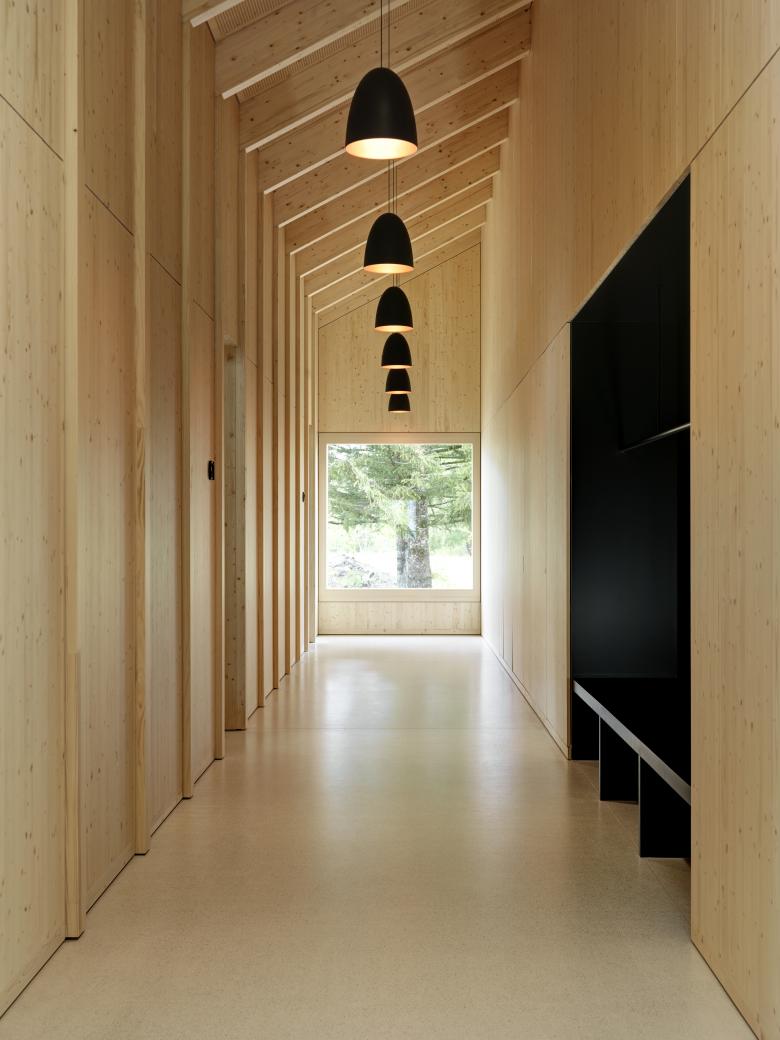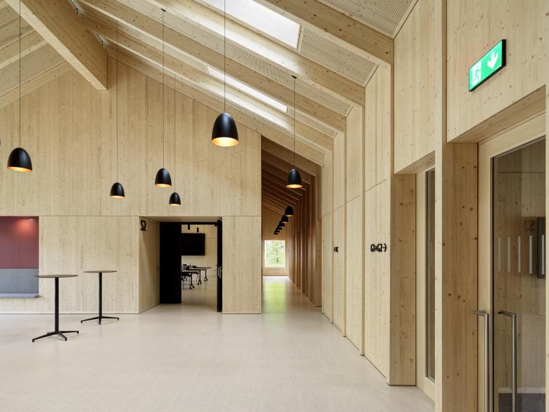 Wie die Aussenhaut ist auch der Innenraum komplett mit Fichtenholz verkleidet. Glatte, strukturierte und perforierte Holzoberflächen erfüllen vielfältige Anforderungen. Neben der wohnlichen Atmosphäre tragen die unbehandelten Holzoberflächen zu einer hervorragenden Akustik und durch die mechanische Befestigung zu einer langlebigen Konstruktion bei.