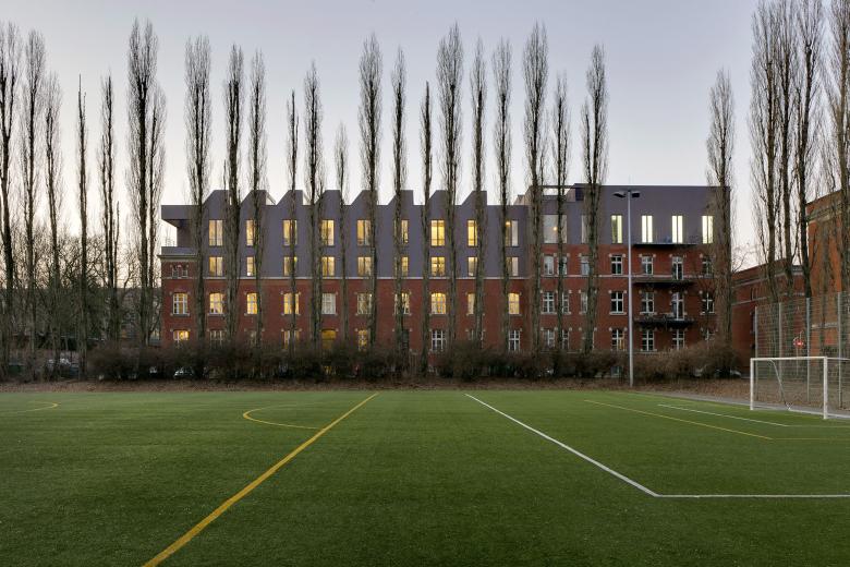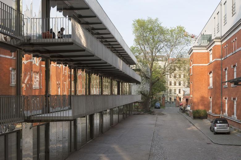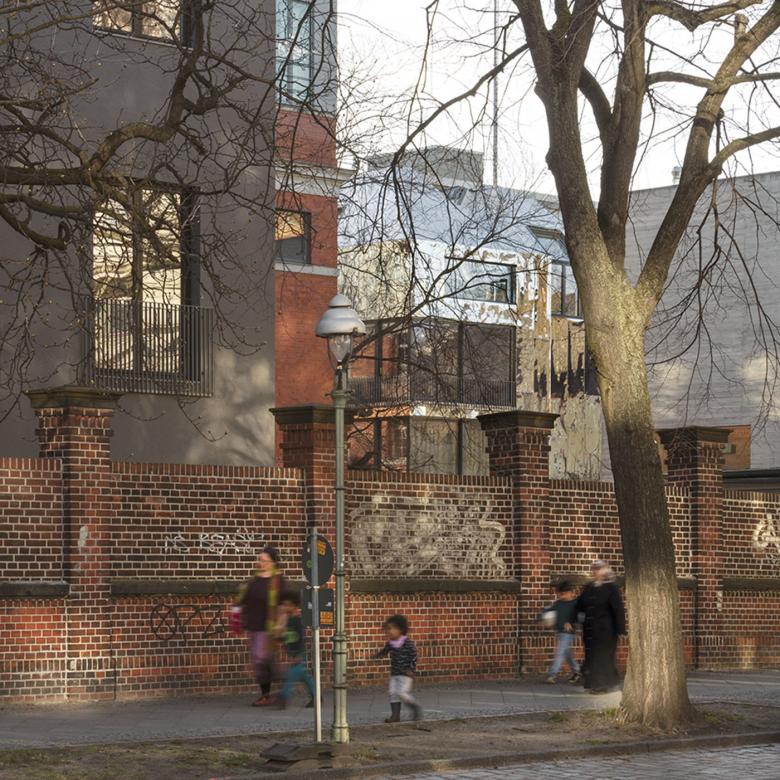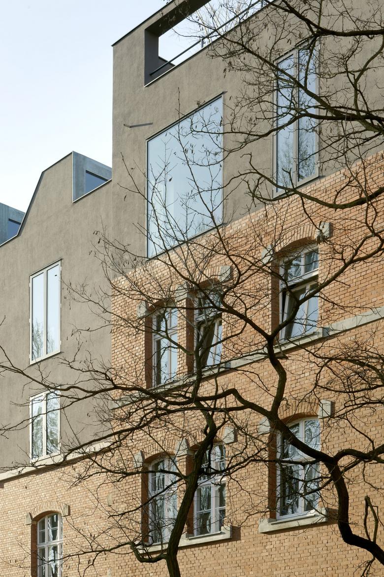 Am Eingang zum Areal entstand 2015 mit Haus 9 ein Neubau für eine Baugruppe. Sein Außenvolumen ist ein Resultat der Ausnutzung baurechtlicher Möglichkeiten auf dem Grundstück. Von den historischen Nachbarn hat das Haus die hohen Decken, die großzügigen Fenster und die einfache Grundstruktur geerbt. Die von Etage zu Etage wechselnden inneren Räumlichkeiten zeugen von den individuellen Vorstellungen, die die verschiedenen Mitglieder der Baugruppe vom Wohnen und Arbeiten haben.