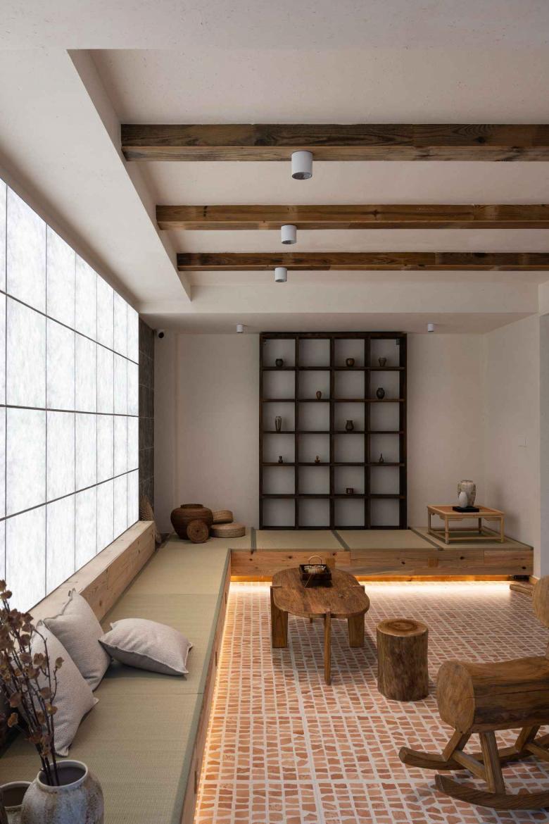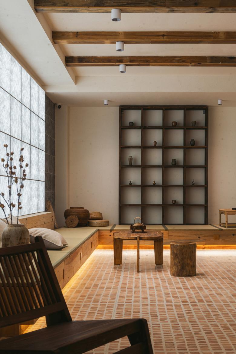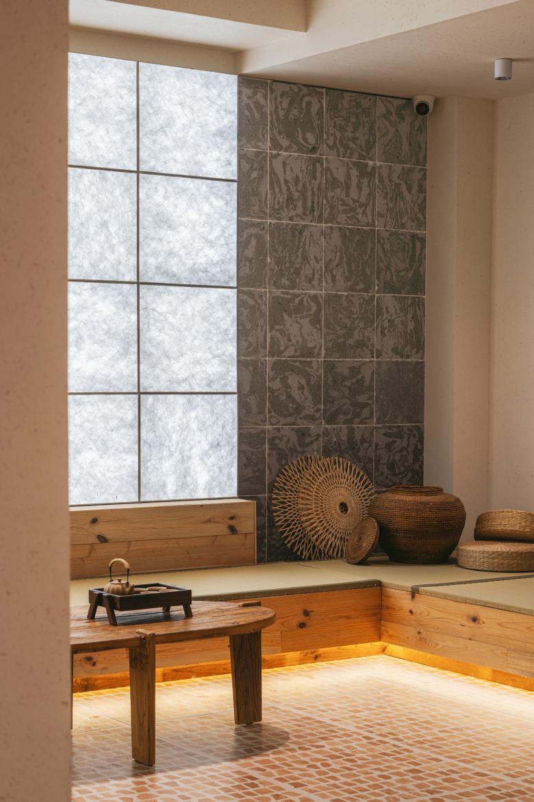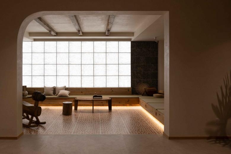 古人和今天泾县的匠人更善于将花砖运用在徽派建筑的外表面上,而在这个设计中,我们尝试将它与长虹玻璃、杜邦纸等现代材料工艺结合,让其融入室内,形成“水墨”与“宣纸”的对话,使空间既具有中国传统山水画的诗意韵味,又具有现代抽象派艺术的气质。