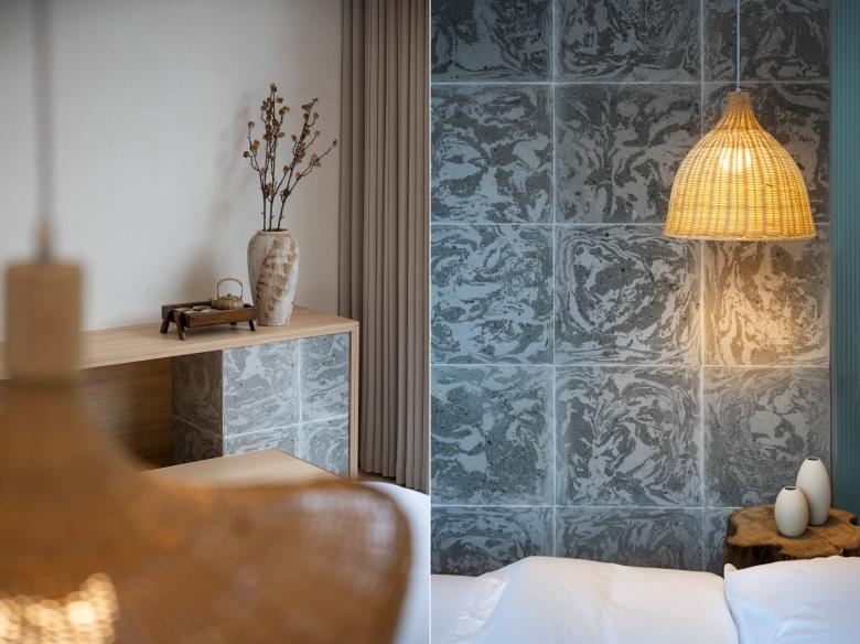 经过平面的局部重构优化,将原有的18间客房合并调整为新布局的14间。这十余个房间自下而上分布于建筑的四个楼层,由于建筑一侧望向河水与村庄,一侧紧邻道路与山峦,不同楼层、朝向的房间都有着截然不同的外部条件,加之民宿主人对于产品功能多样性的诉求,几乎每个房间都被赋予了不同的性格: