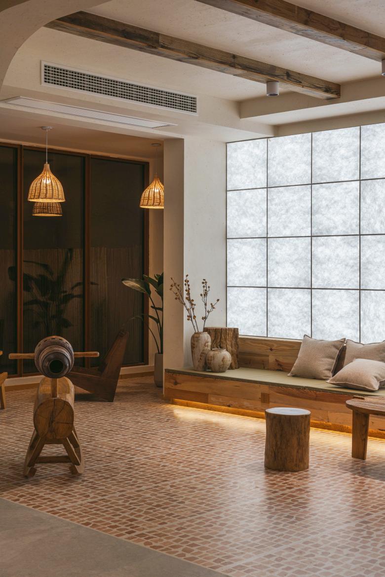 茂林青砖和杜邦纸,小花砖与原生木料,不同材质肆意碰撞,为空间参与者预留了最大的自由度与探索空间。家具采用粗犷的木材和竹编,不追求精致的边角和收口,反而未经雕琢的自然美感对这里来说更加难能可贵。相较于千篇一律的工业流程化“产品”,我们更希望这里呈现出民宿主悉心打理并不断变化的状态:虽不完美,但充满生命力。