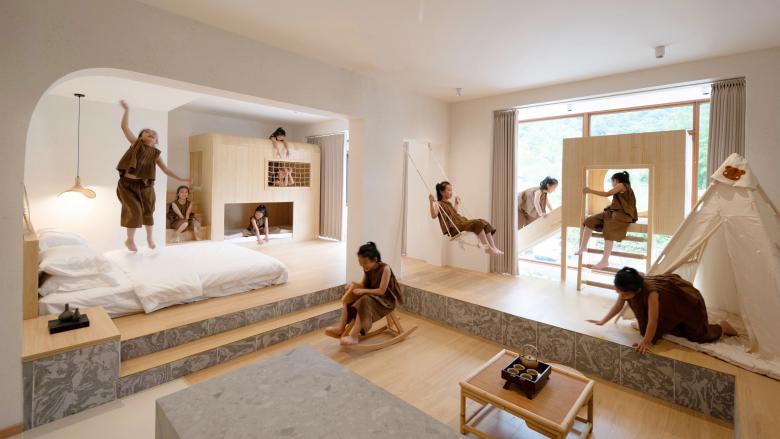 二层两间旧客房被合并成了家庭亲子套房,确保空间开敞通透的同时,通过室内高差暗示动静分区,划分出起居和卧室空间,也丰富了垂直体验。原有的两个露台被合二为一,形成带状长廊,借由卧室区榻榻米和起居室沙发的抬高,自然形成户外能看到的海洋球池和滑梯区,这也成了建筑最好的空间昭示面;