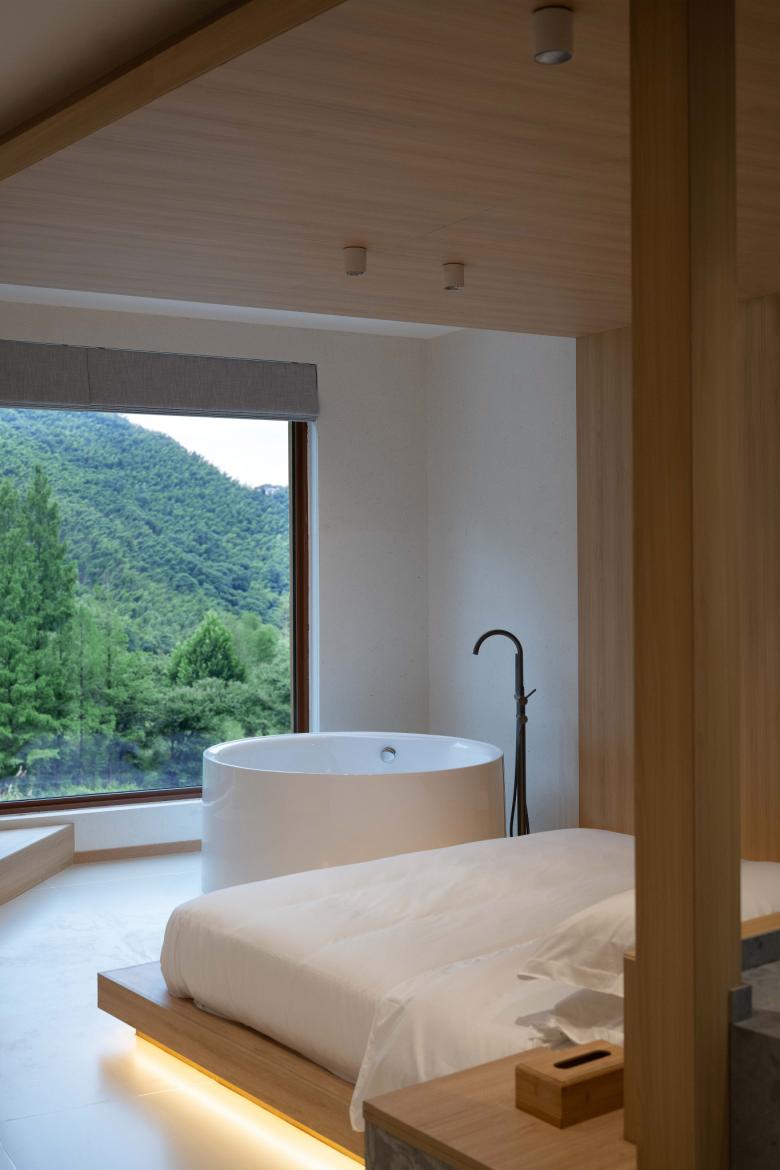三层客房结合浴缸布局,将榻榻米朝向微调后,摒弃了对极致视野的盲目追求,也规避了对面山上破旧自建房的消极视线;四层结合公共露台设置向外延申的灰空间,模糊了室内外边界;北向客房则更多考虑与溪水的互动。