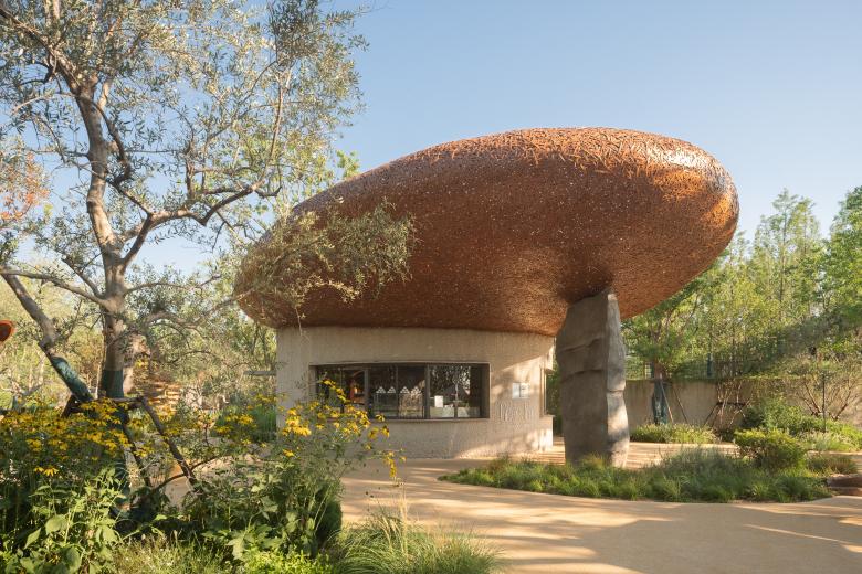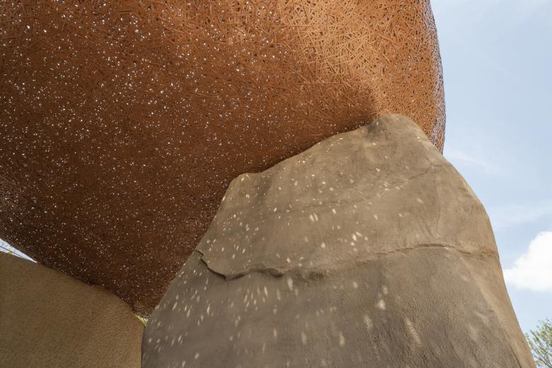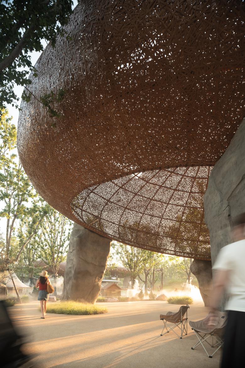 Triangular cut-outs in the bamboo dome scatter dynamic patterns of light and shadow. As a key social hub, this space serves as both a resting stop and a café. The open courtyard extends into the surrounding greenery, cultivating a a relaxed, artisanal atmosphere.