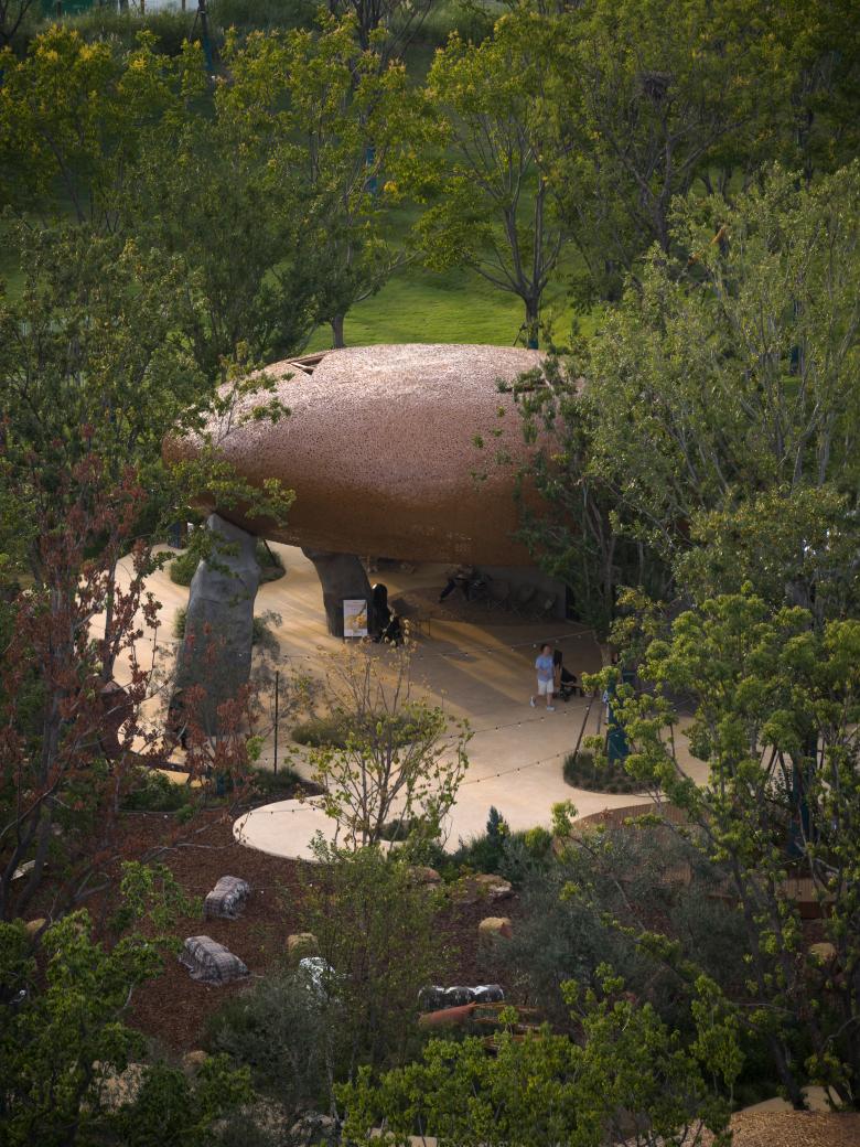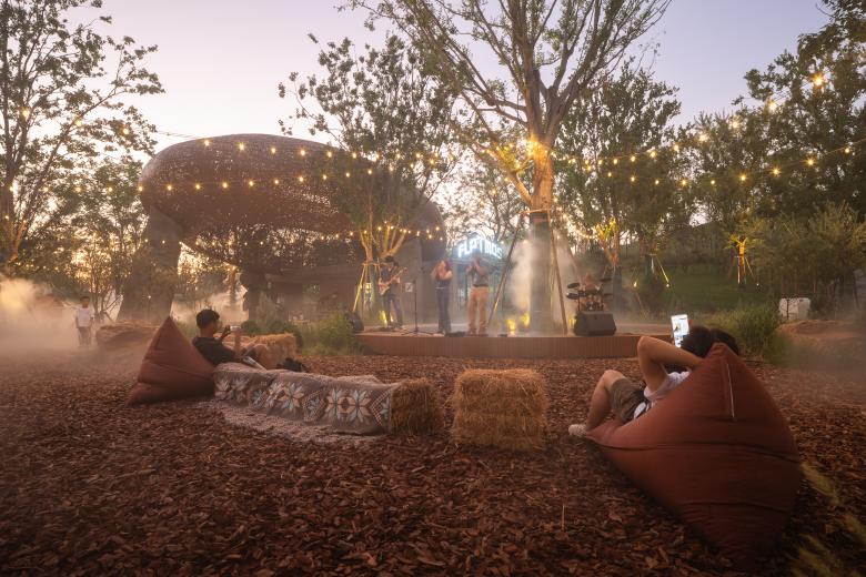A second dessert station, shaped like a UFO with a cantilevered metallic canopy, exudes a striking sense of futurism. In contrast to the earthy tones elsewhere, its sleek metallic form serves as a visual landmark and directional cue within the site.