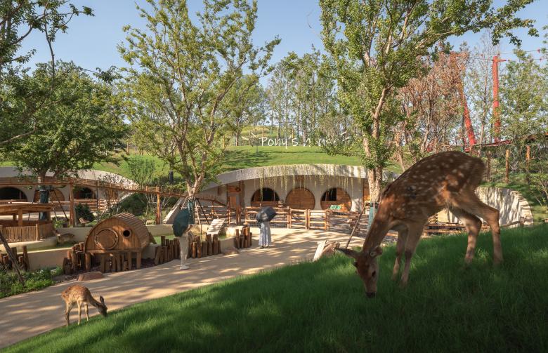 The animal zone blends habitat, interaction, and ecological education, with enclosures, resting pavilions, and coffee and donut shops forming a functional cluster. The low-intervention design tucks enclosures beneath the slopes, minimizing their visual presence. The gentle incline allows animals to roam the grass, while the earth-covered shelters provide safety and comfort.