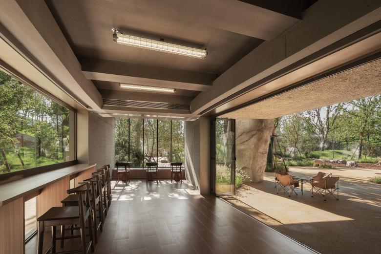 The outdoor space functions as both a rest area and an extension for interaction with nature and animals. Large operable facades dissolve the boundary between indoors and out, supporting artisanal craftwork, gatherings, and exhibitions.